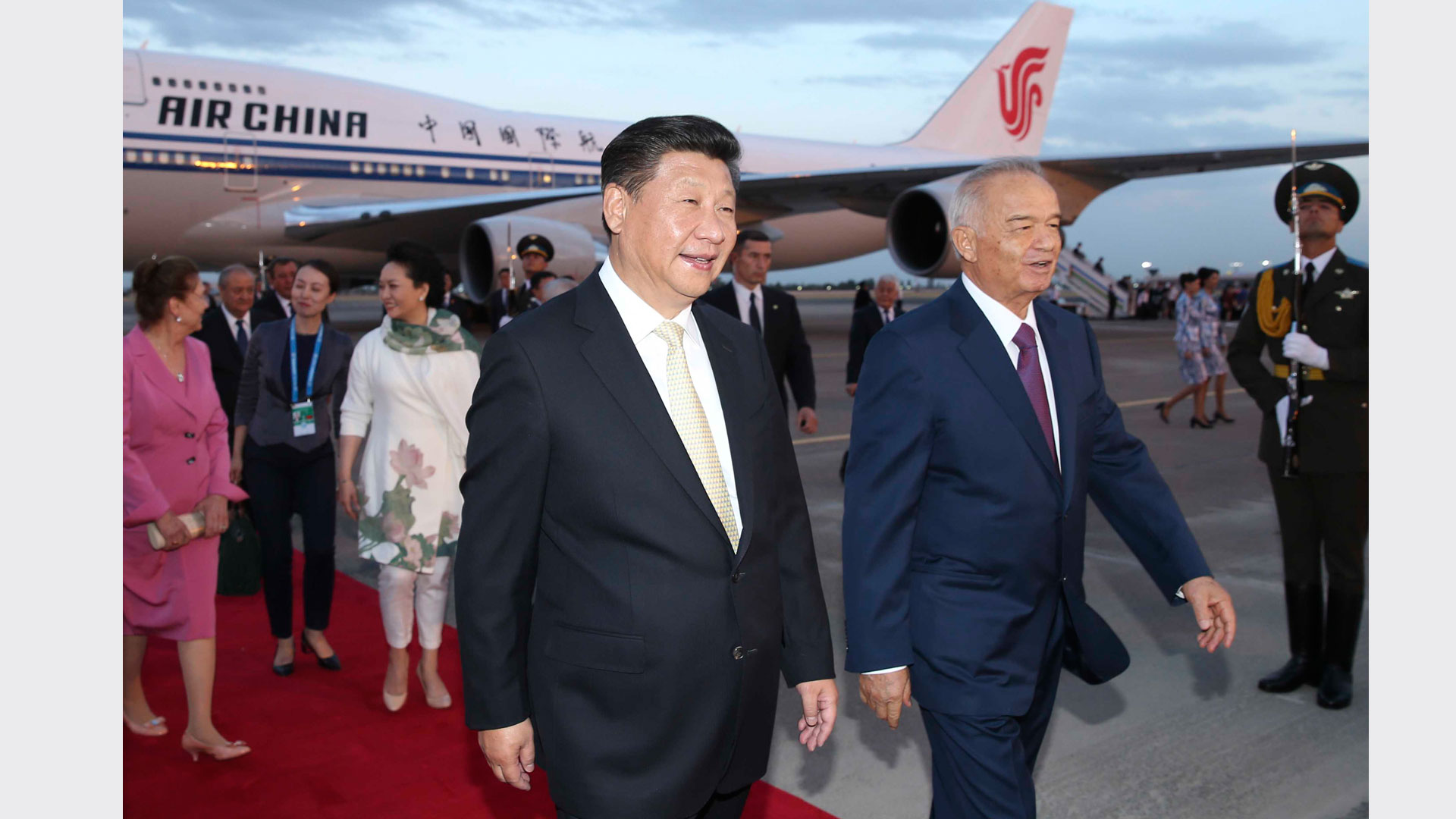 当地时间6月21日晚,国家主席习近平乘专机抵达塔什干,继续对乌兹别克斯坦进行国事访问并将出席在塔什干举行的上海合作组织成员国元首理事会第十六次会议。乌兹别克斯坦总统卡里莫夫和夫人卡里莫娃在塔什干机场热情迎接习近平主席和夫人彭丽媛。新华社记者兰红光摄