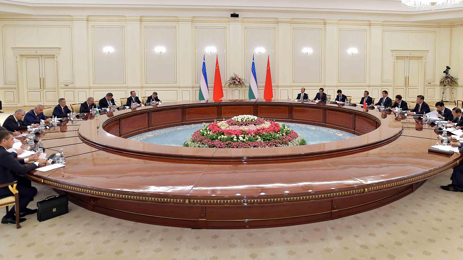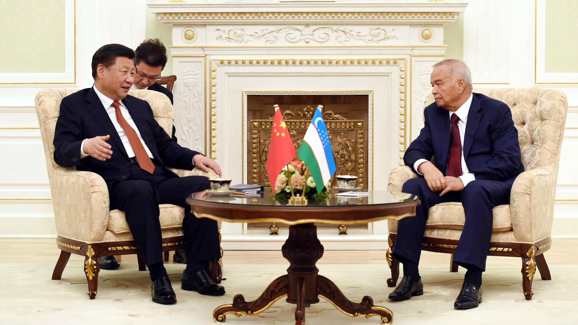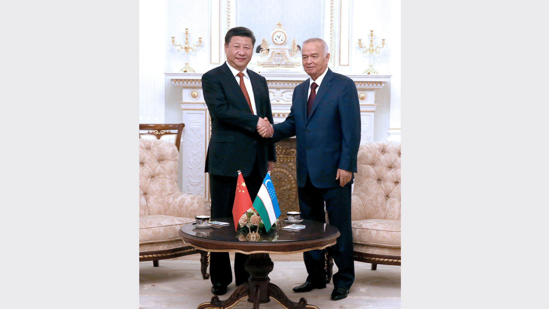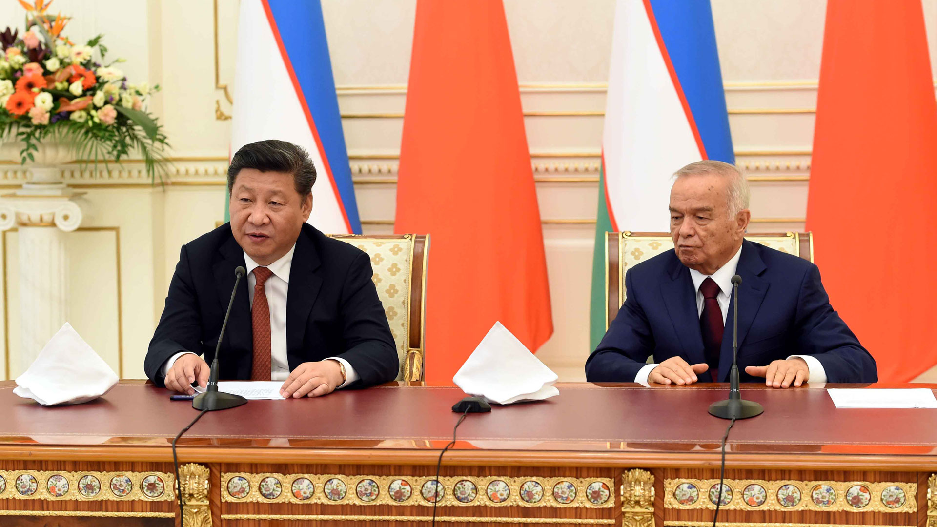 6月22日,国家主席习近平在塔什干库克萨莱国宾馆同乌兹别克斯坦总统卡里莫夫举行会谈。新华社记者李涛摄