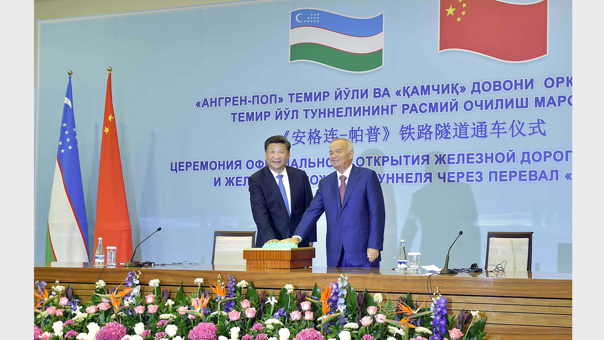 6月22日,国家主席习近平和乌兹别克斯坦总统卡里莫夫在塔什干共同出席“安格连-帕普”铁路隧道通车视频连线活动。新华社记者李涛摄