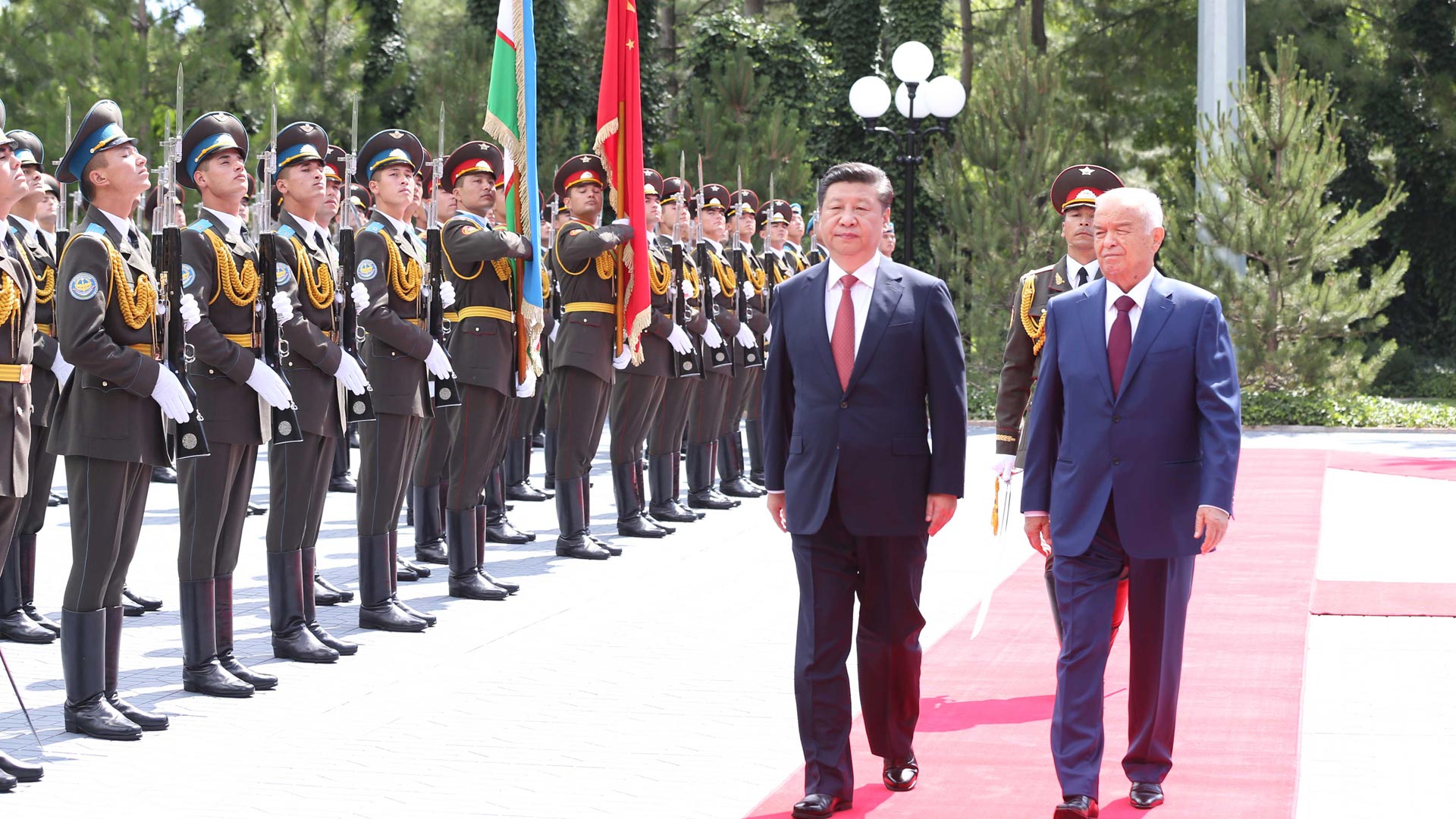 6月22日,国家主席习近平在塔什干库克萨莱国宾馆同乌兹别克斯坦总统卡里莫夫举行会谈。会谈前,习近平出席卡里莫夫举行的欢迎仪式。新华社记者马占成摄