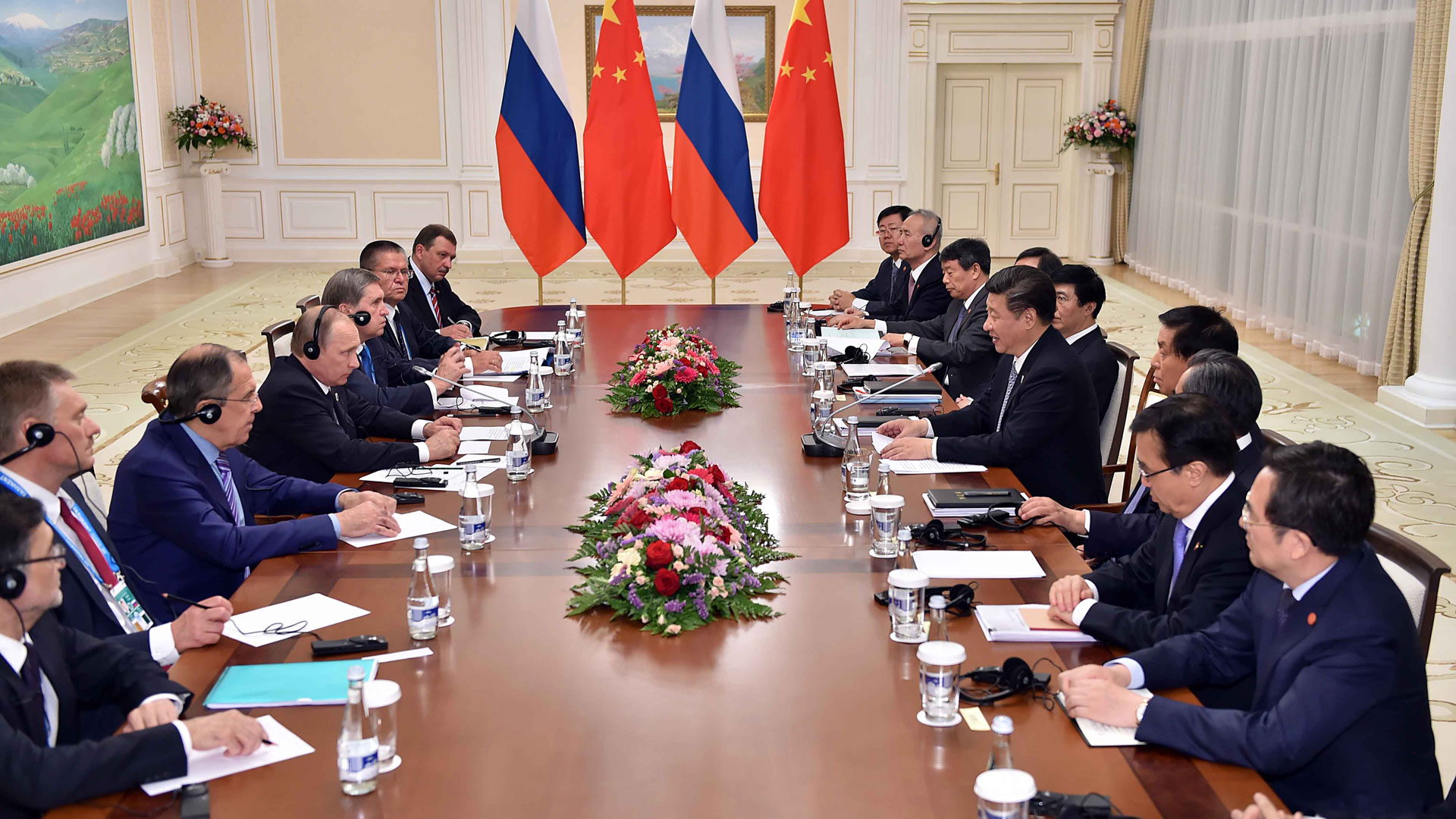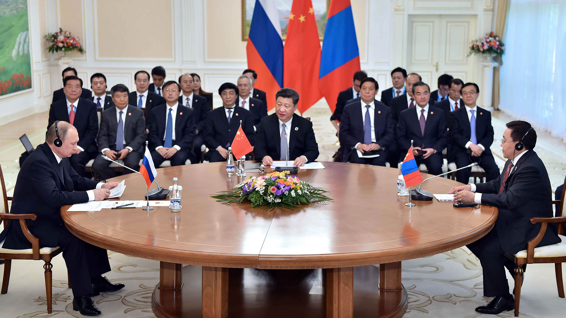 6月23日,国家主席习近平在乌兹别克斯坦塔什干同俄罗斯总统普京、蒙古国总统额勒贝格道尔吉举行中俄蒙元首第三次会晤。习近平主持会晤。新华社记者李涛摄