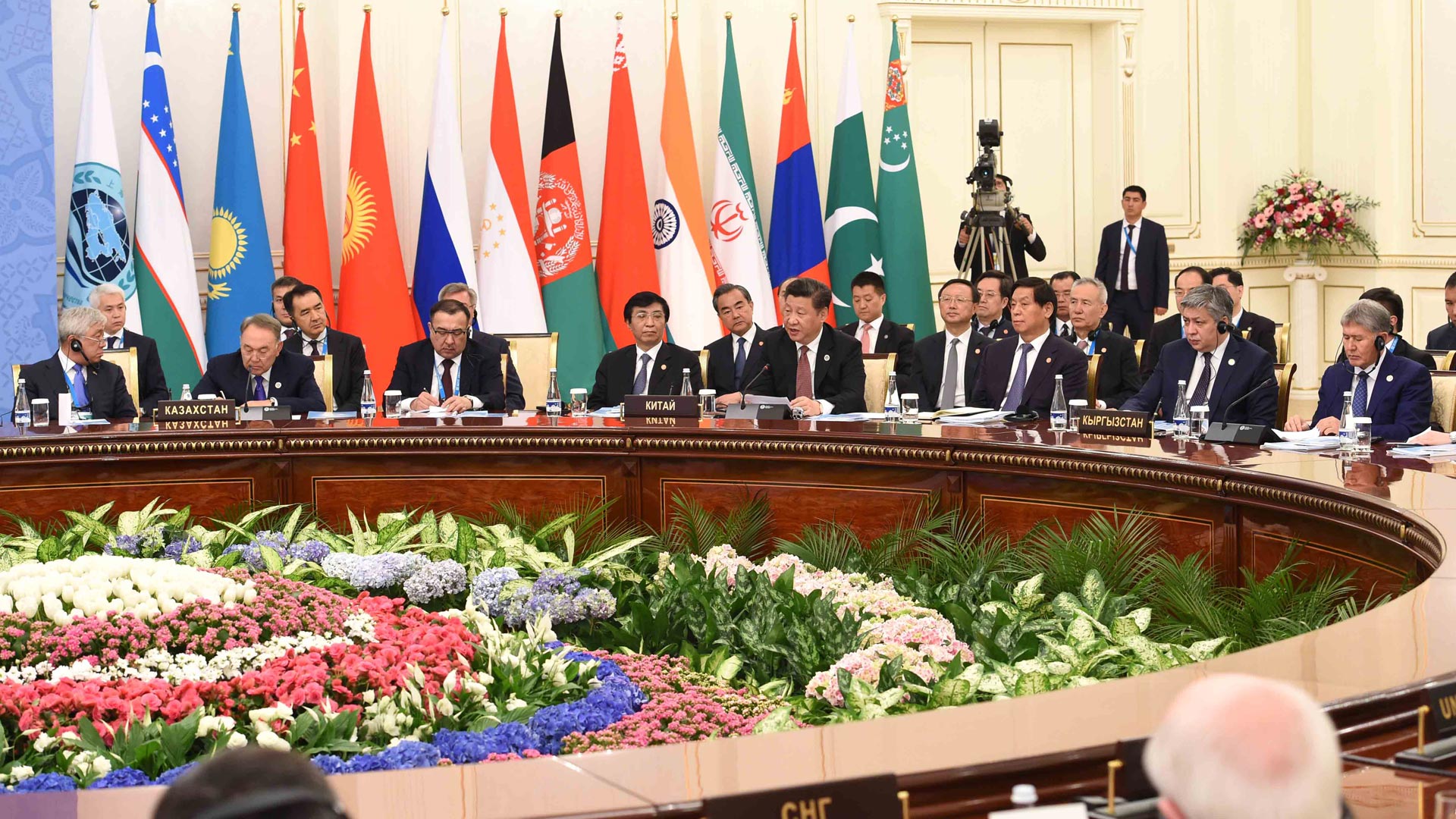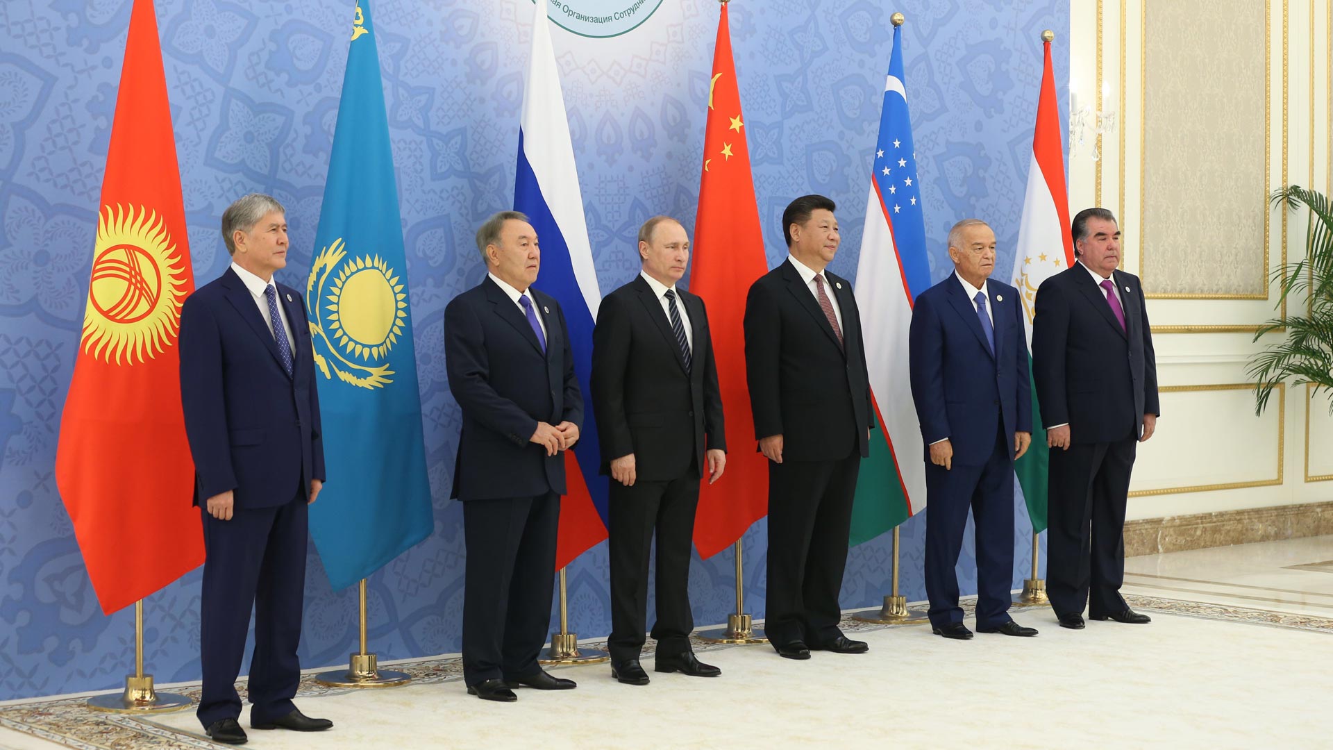 6月24日,国家主席习近平在乌兹别克斯坦塔什干出席上海合作组织成员国元首理事会第十六次会议并发表重要讲话。这是大范围会谈开始前,习近平同哈萨克斯坦总统纳扎尔巴耶夫、吉尔吉斯斯坦总统阿坦巴耶夫、俄罗斯总统普京、塔吉克斯坦总统拉赫蒙、乌兹别克斯坦总统卡里莫夫,观察员国阿富汗总统加尼、白俄罗斯总统卢卡申科、印度总理莫迪、蒙古国总统额勒贝格道尔吉、巴基斯坦总统侯赛因、伊朗外交部长扎里夫,主席国客人土库曼斯坦总统别尔德穆哈梅多夫以及有关国际和地区组织代表集体合影。新华社记者 丁林 摄