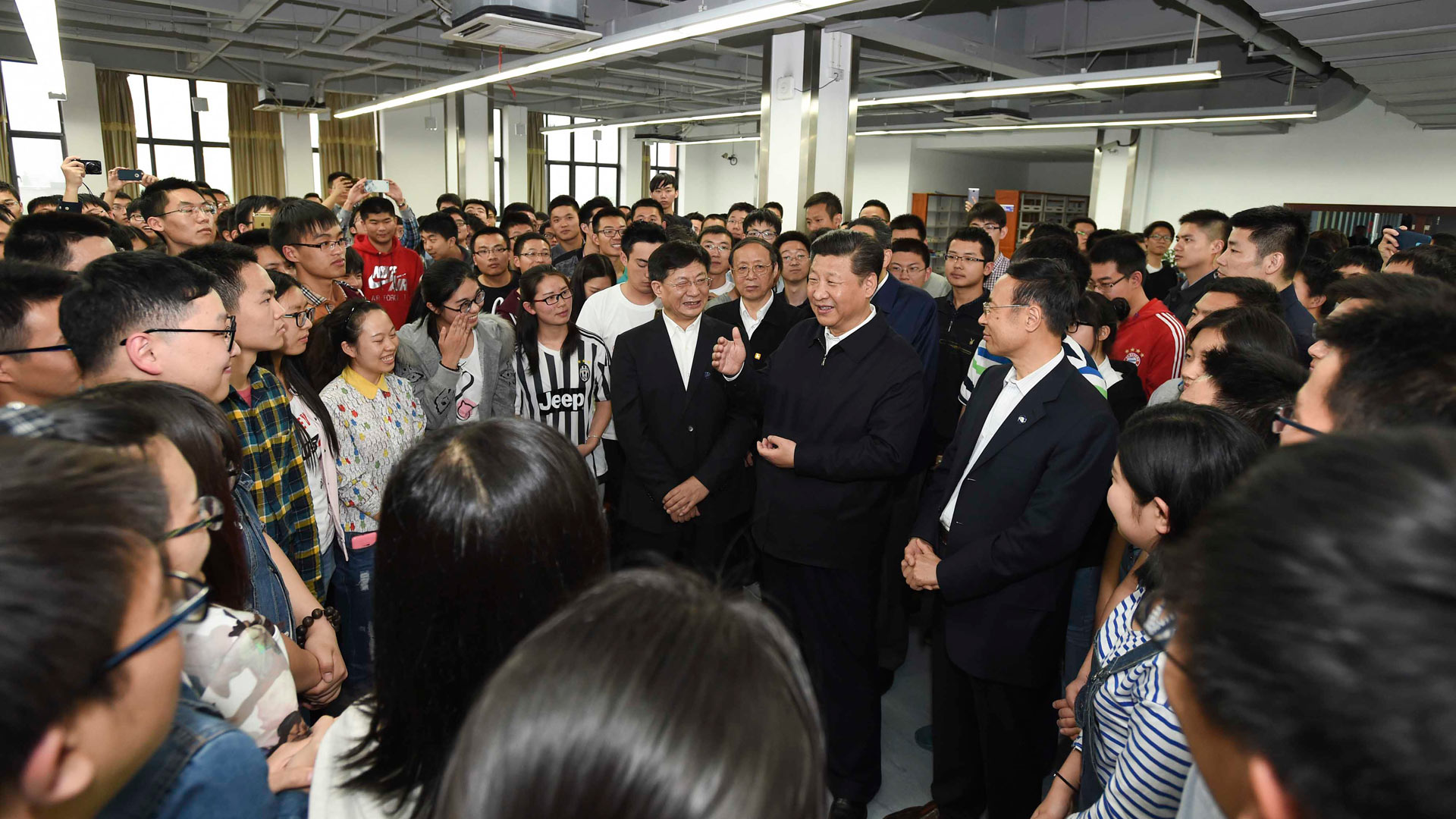 4月24日至27日,中共中央总书记、国家主席、中央军委主席习近平在安徽调研。这是4月26日下午,习近平在中国科技大学图书馆与正在上自习的学生们亲切交谈。 新华社记者李学仁摄