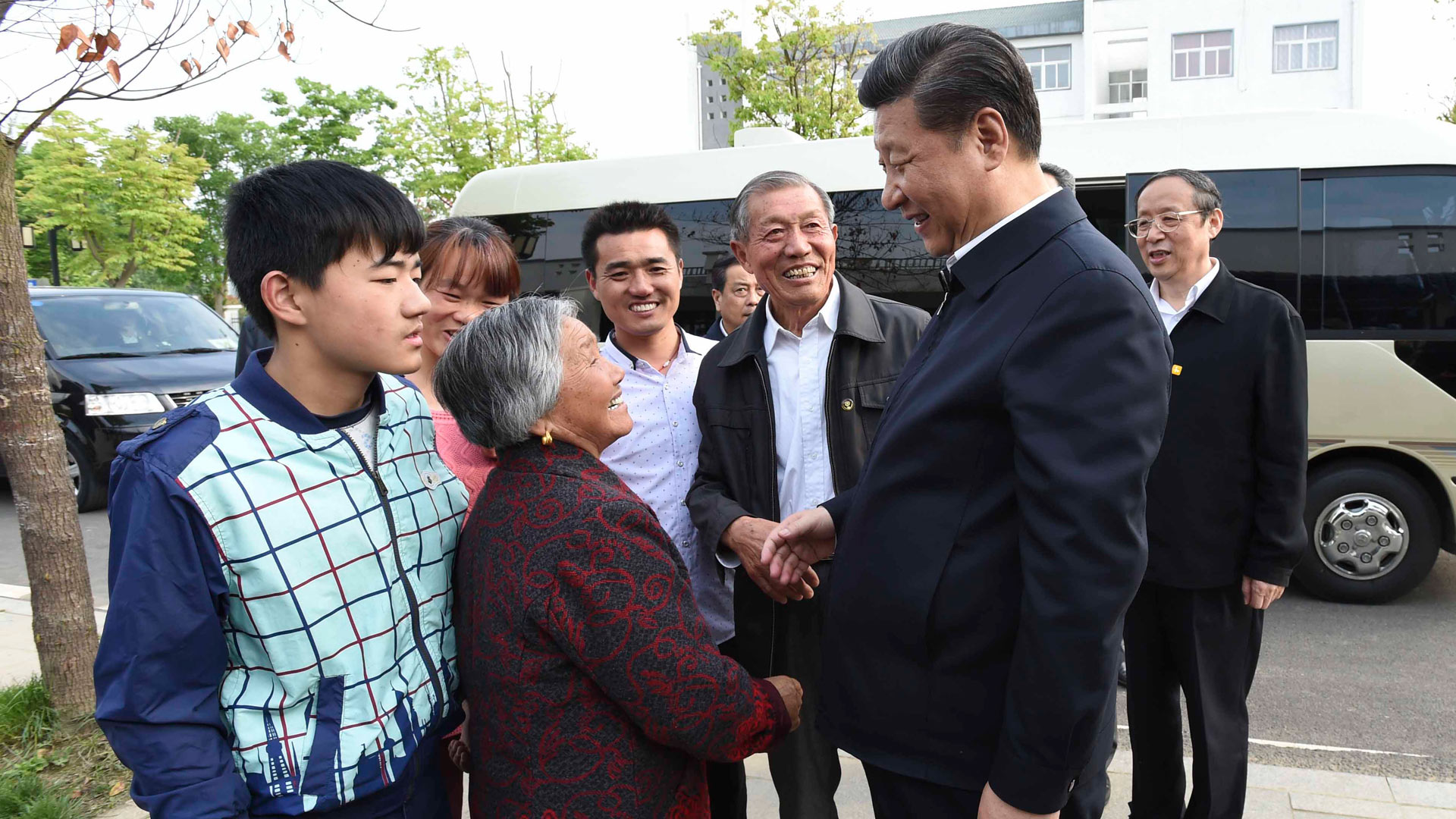 4月24日至27日,中共中央总书记、国家主席、中央军委主席习近平在安徽调研。这是4月25日下午,习近平在滁州市凤阳县小岗村向村民们问好。 新华社记者李涛摄