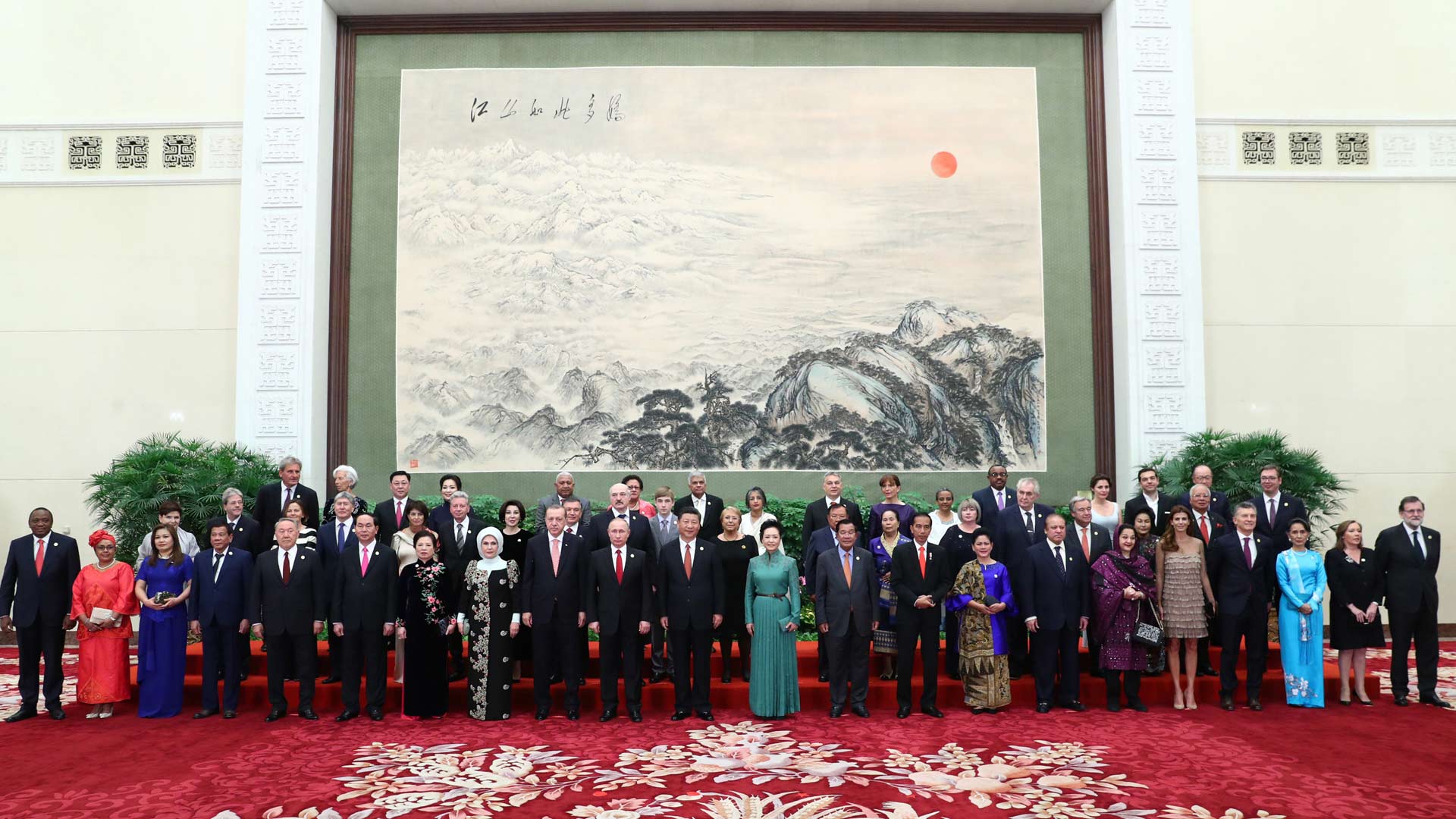 5月14日,国家主席习近平在北京人民大会堂举行宴会,欢迎出席“一带一路”国际合作高峰论坛的外方代表团团长及嘉宾。这是习近平和夫人彭丽媛同外方代表团团长及配偶集体合影留念。新华社记者 谢环驰 摄
