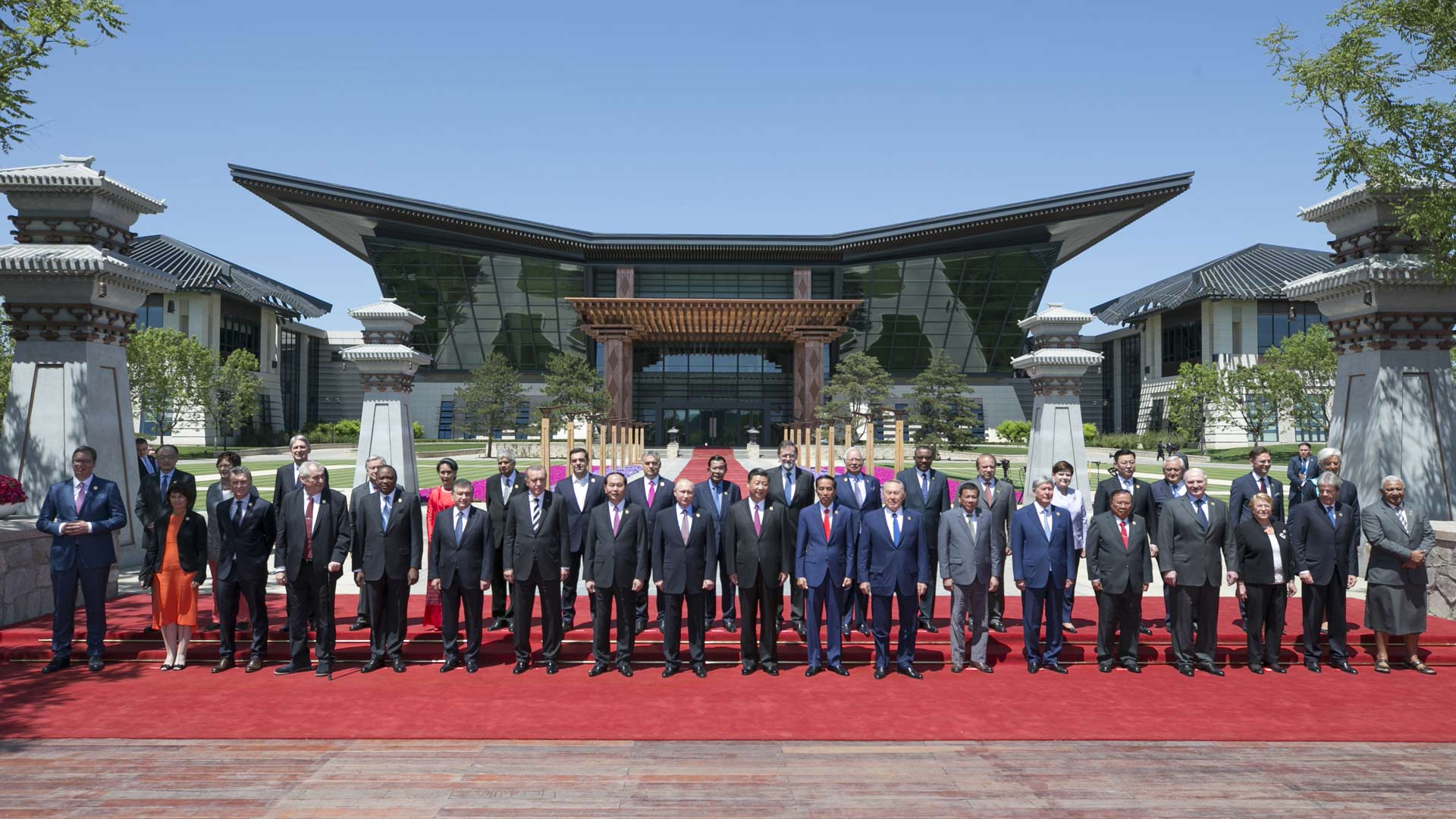 5月15日,“一带一路”国际合作高峰论坛圆桌峰会在北京雁栖湖国际会议中心举行,国家主席习近平主持会议并致开幕辞。这是第一阶段会议结束后,习近平同外方代表团团长及嘉宾在雁栖湖国际会议中心前合影。新华社记者 姚大伟 摄