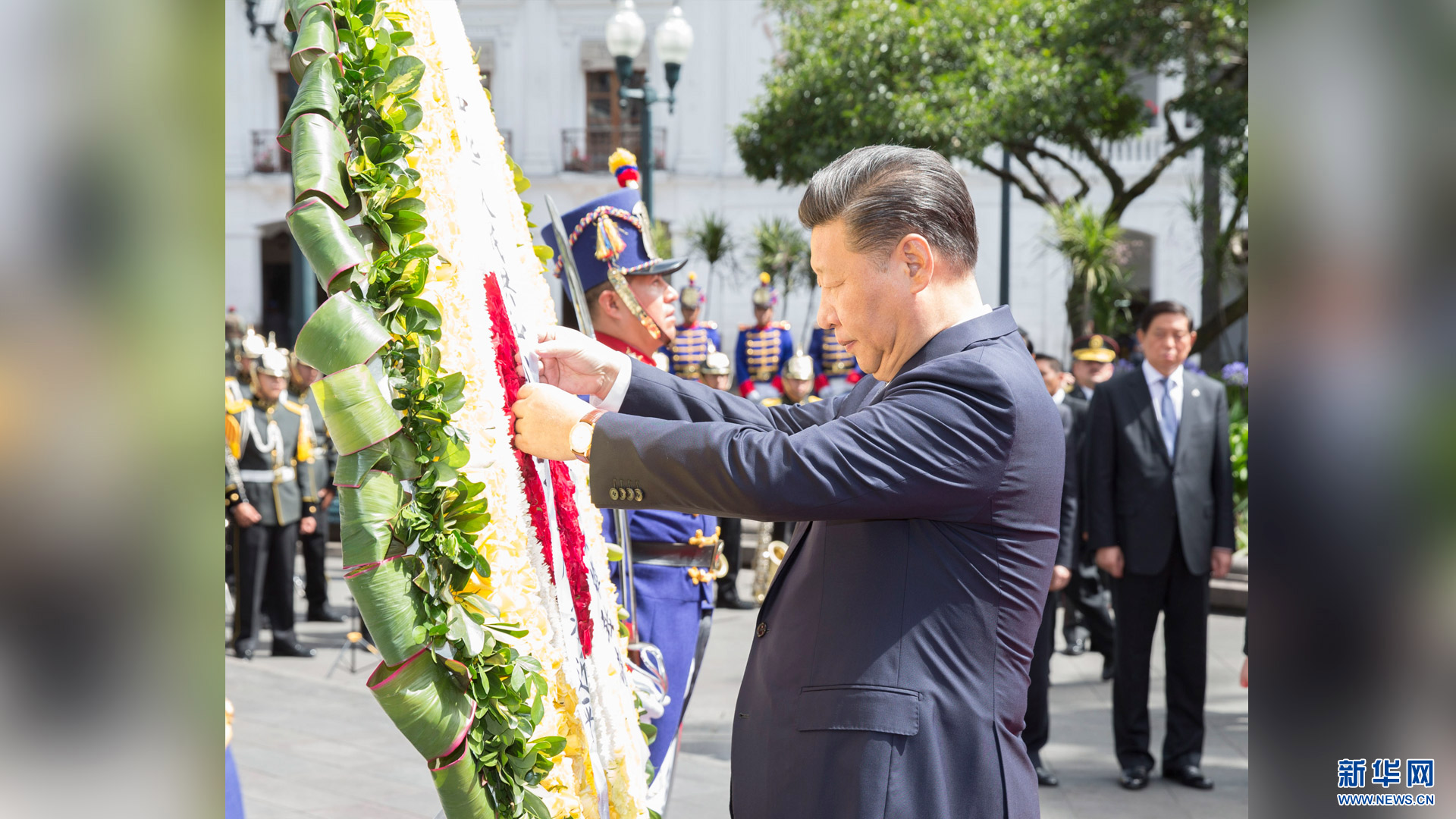 当地时间11月18日,国家主席习近平向厄瓜多尔独立英雄纪念碑敬献花圈。 新华社记者 黄敬文 摄2016-11-19