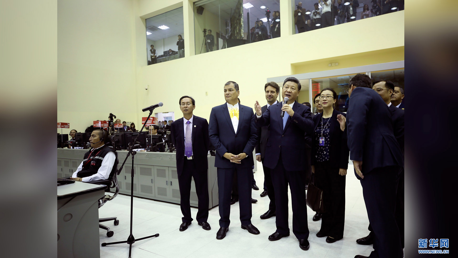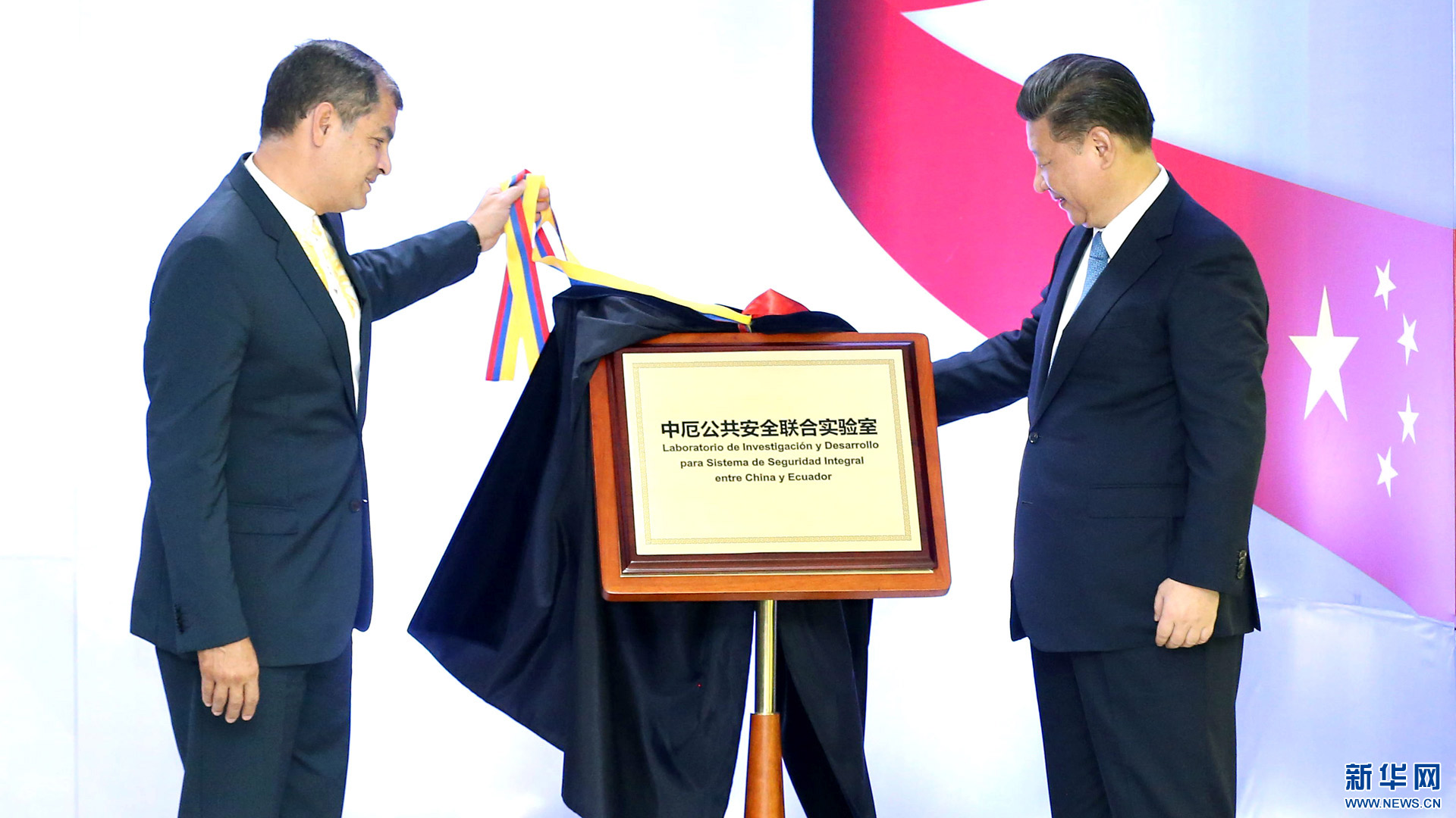 当地时间11月18日,国家主席习近平在基多同厄瓜多尔总统科雷亚共同出席中方援建的厄瓜多尔公共安全应急指挥中心联合实验室揭牌仪式,乔内医院奠基、科卡科多-辛克雷水电站竣工发电视频连线活动。这是两国元首共同为厄瓜多尔公共安全应急指挥中心联合实验室揭牌。新华社记者 马占成 摄2016-11-19