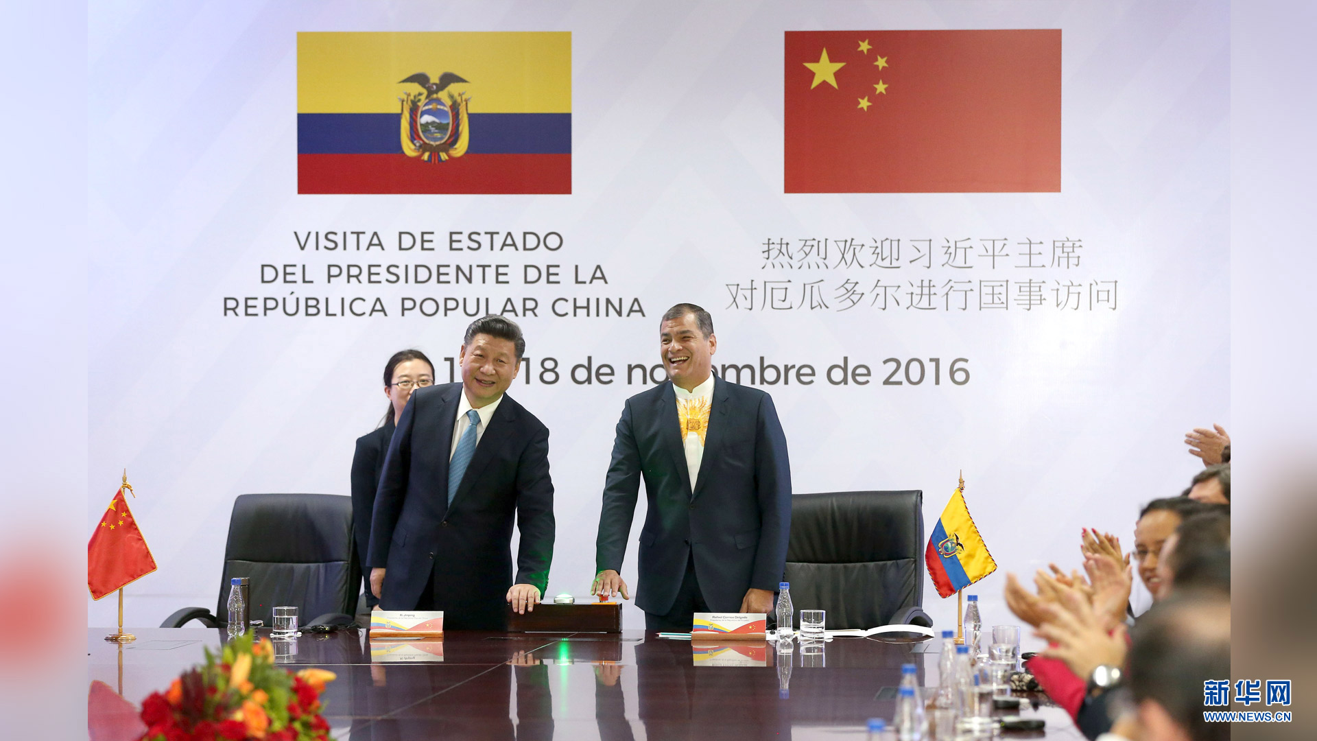 当地时间11月18日,国家主席习近平在基多同厄瓜多尔总统科雷亚共同出席中方援建的厄瓜多尔公共安全应急指挥中心联合实验室揭牌仪式,乔内医院奠基、科卡科多-辛克雷水电站竣工发电视频连线活动。这是两国元首共同按动按钮,辛克雷水电站正式竣工发电。新华社记者 马占成 摄2016-11-19