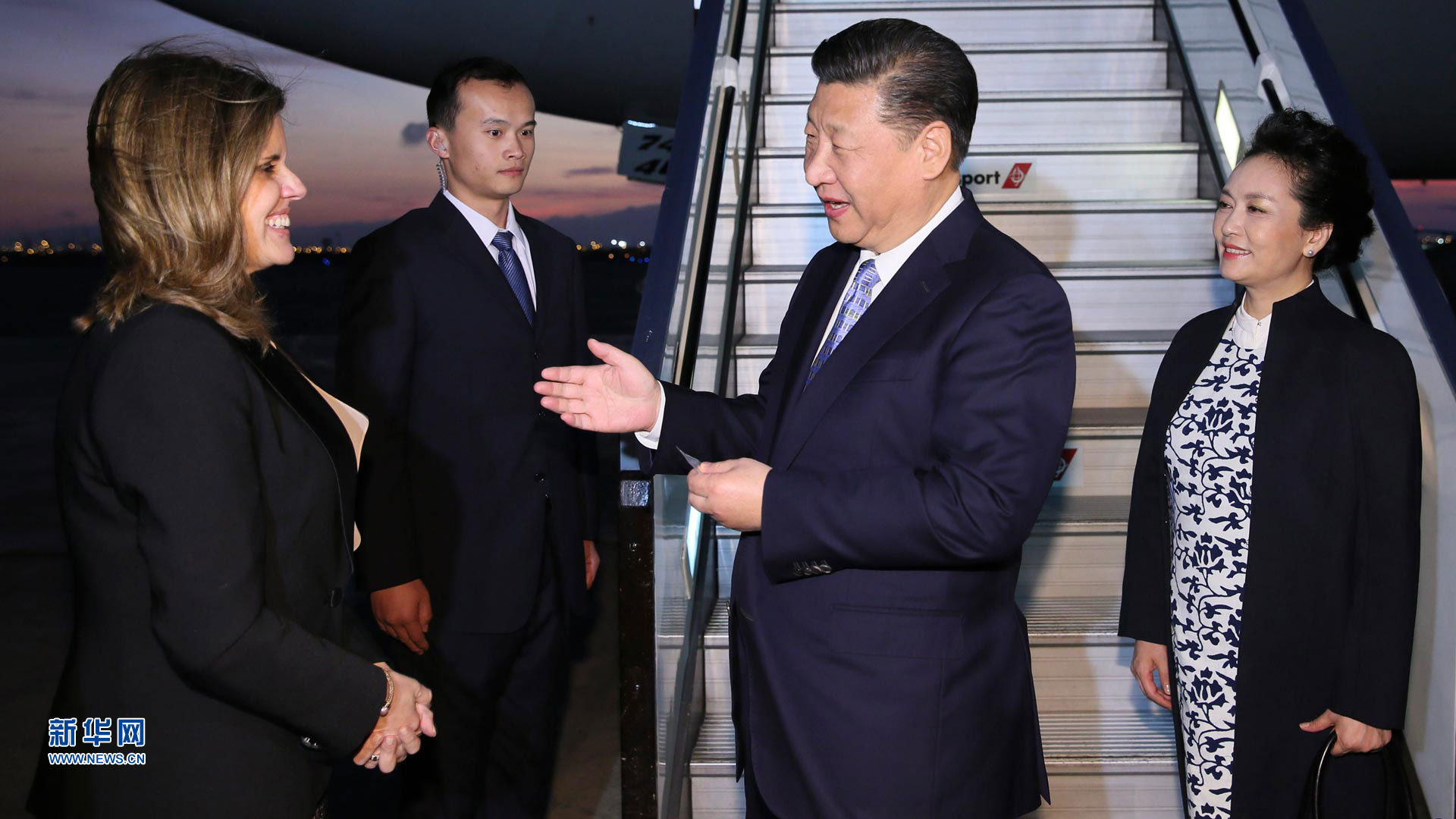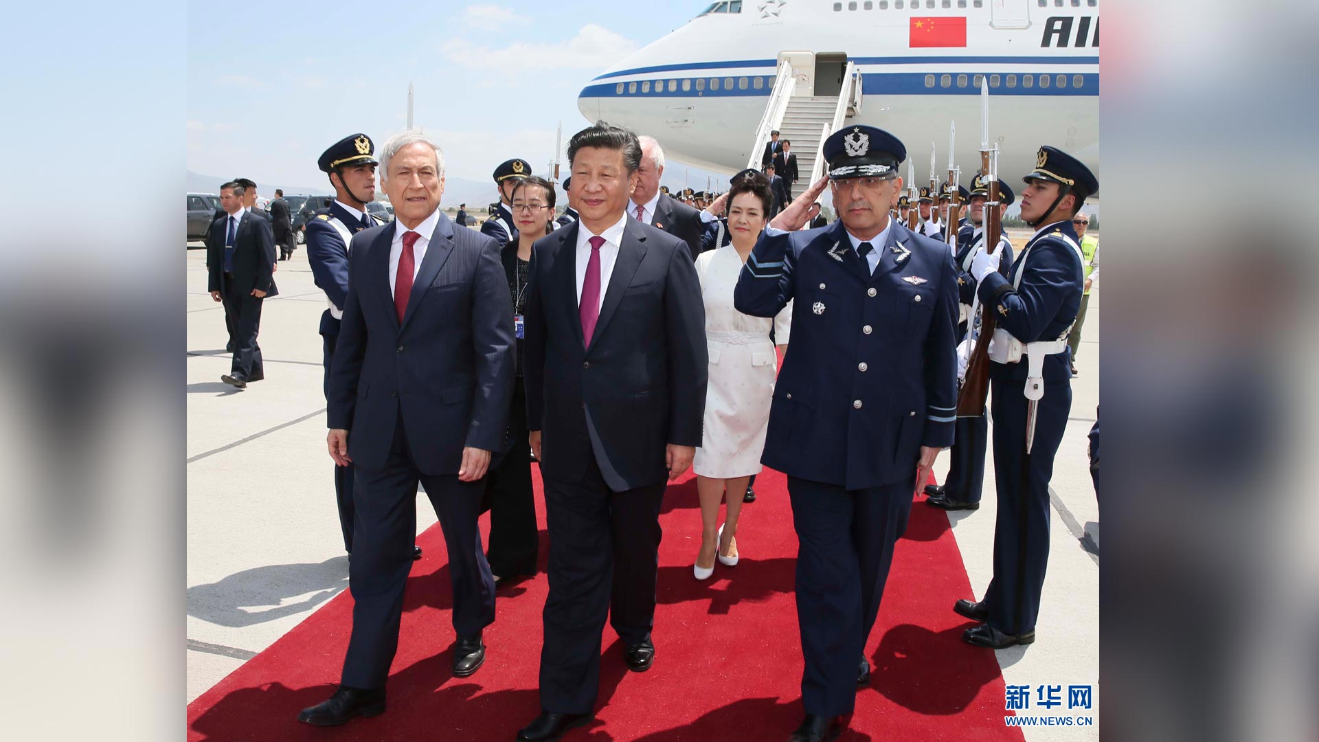 11月22日,国家主席习近平抵达圣地亚哥,对智利共和国进行国事访问。智利外长穆尼奥斯等在机场迎接习近平和夫人彭丽媛。 新华社记者兰红光 摄2016-11-23