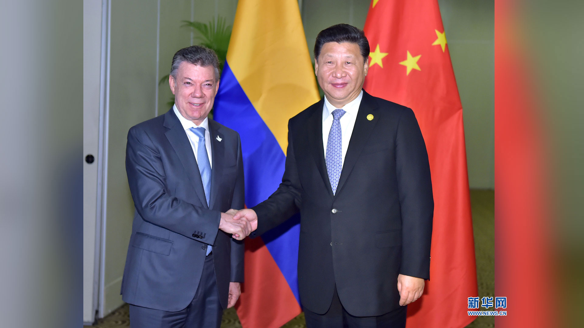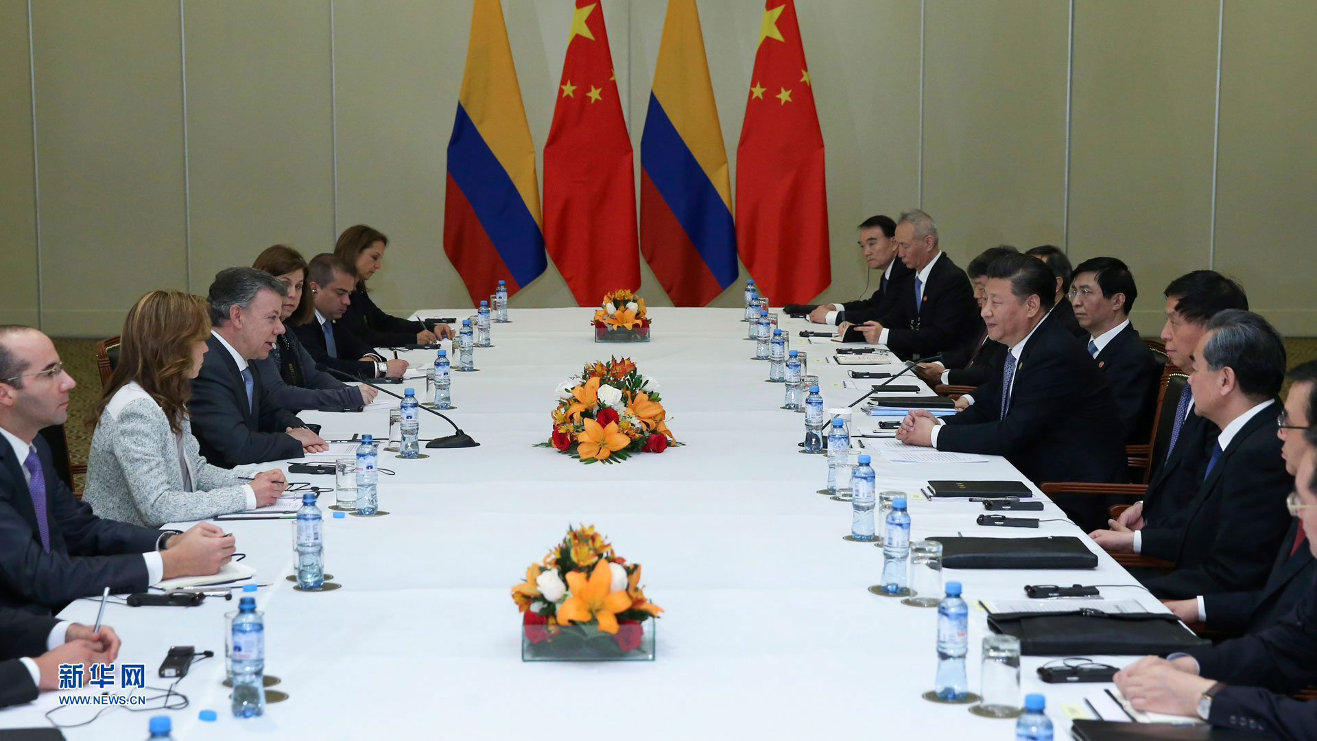 11月19日,国家主席习近平在利马会见哥伦比亚总统桑托斯。新华社记者 庞兴雷 摄2016-11-20