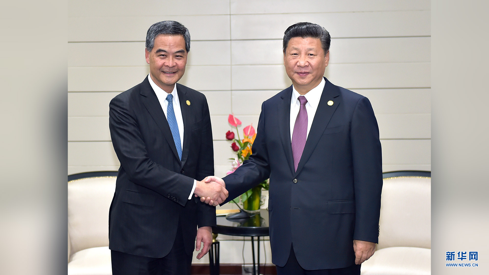 11月20日,国家主席习近平在秘鲁首都利马会见前来出席亚太经合组织第二十四次领导人非正式会议的香港特别行政区行政长官梁振英。新华社记者 李涛 摄2016-11-21