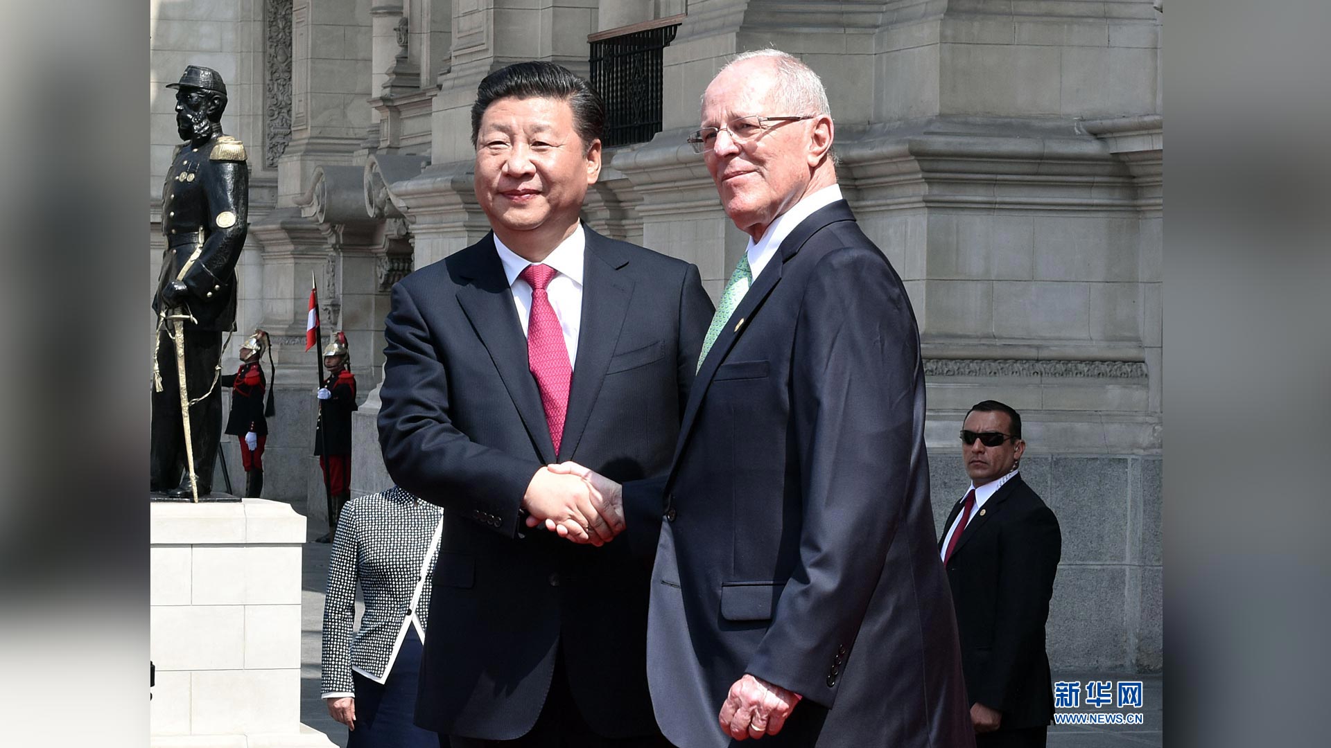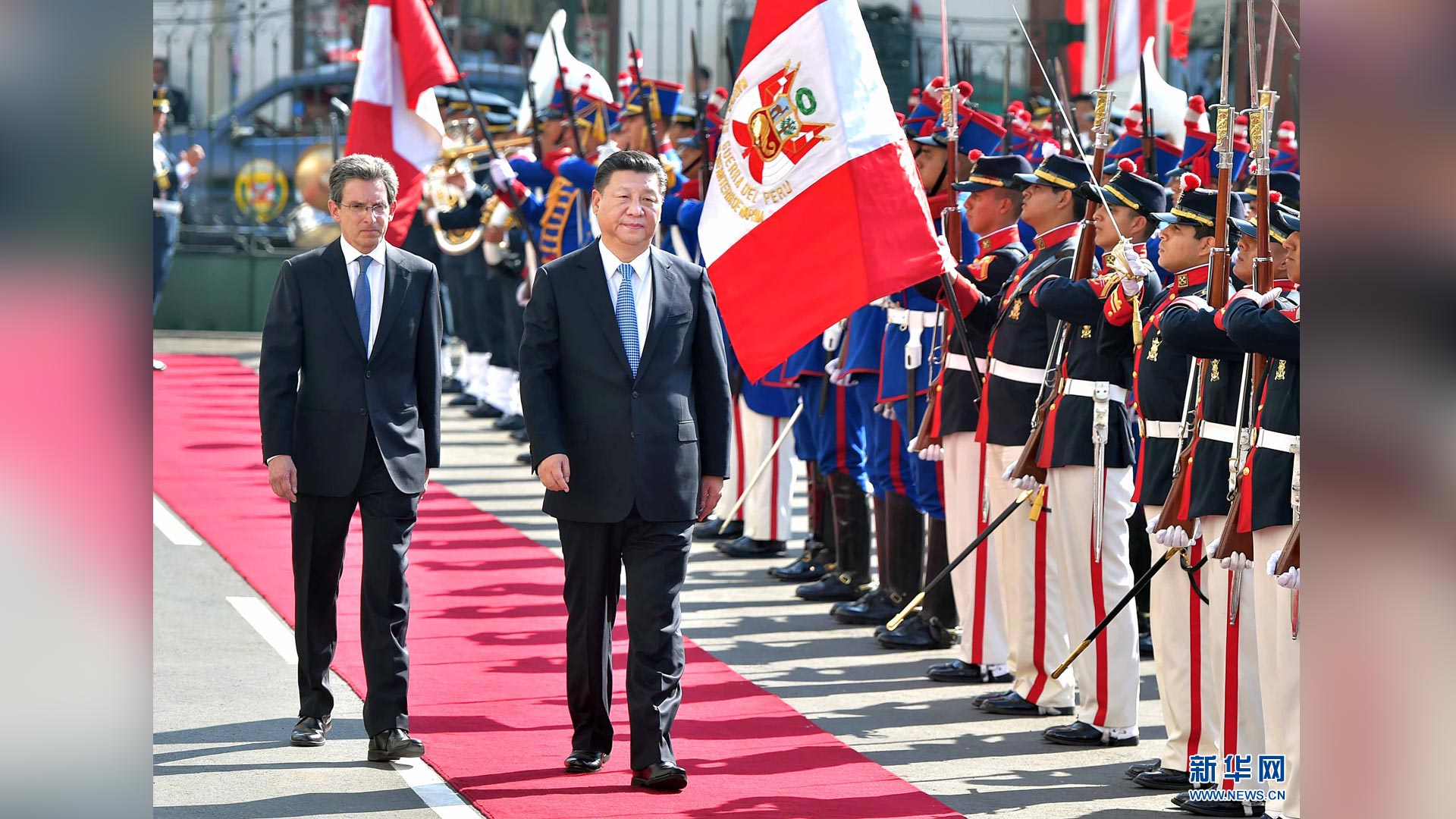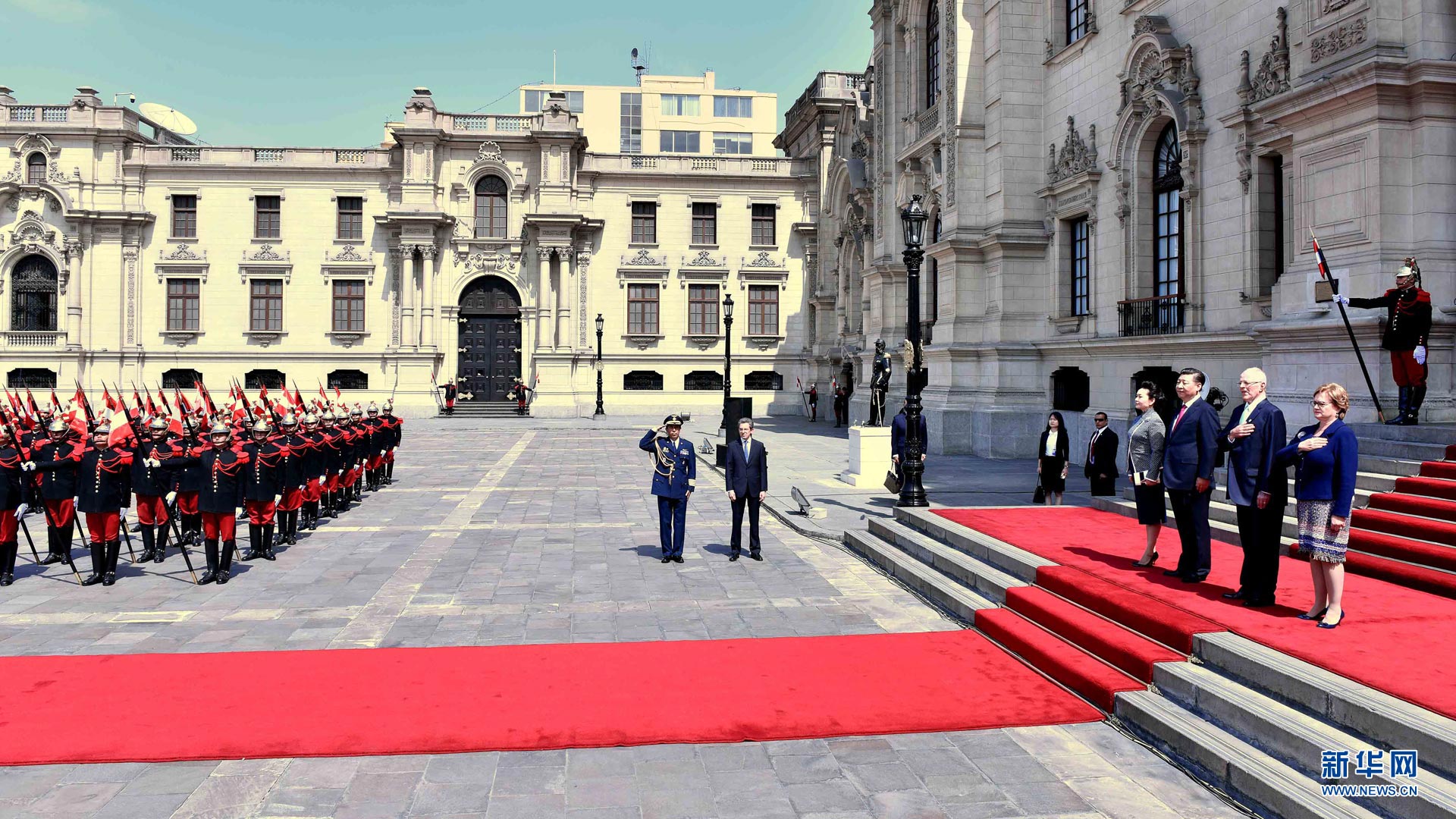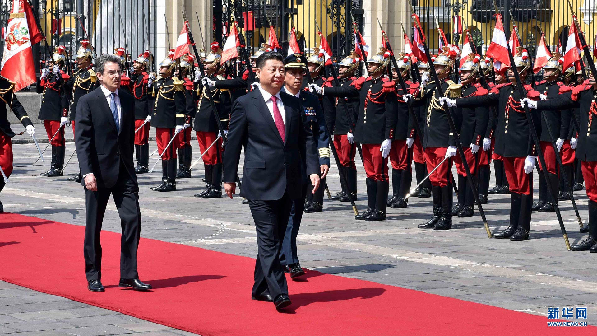 11月21日,国家主席习近平在利马同秘鲁总统库琴斯基举行会谈。会谈前,习近平出席库琴斯基在总统府前广场举行的欢迎仪式。 新华社记者李涛 摄2016-11-23