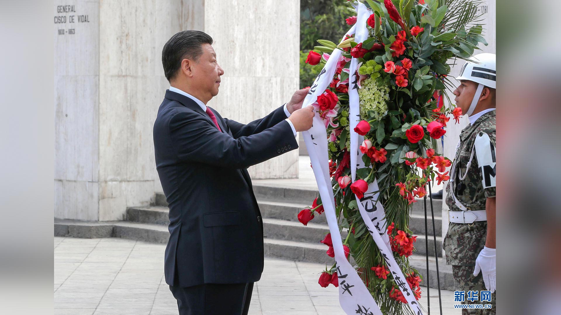 11月21日,国家主席习近平在利马同秘鲁总统库琴斯基举行会谈。会谈前,在库琴斯基夫妇陪同下,习近平和彭丽媛向秘鲁独立先驱纪念碑敬献花圈。新华社记者 丁林 摄2016-11-23