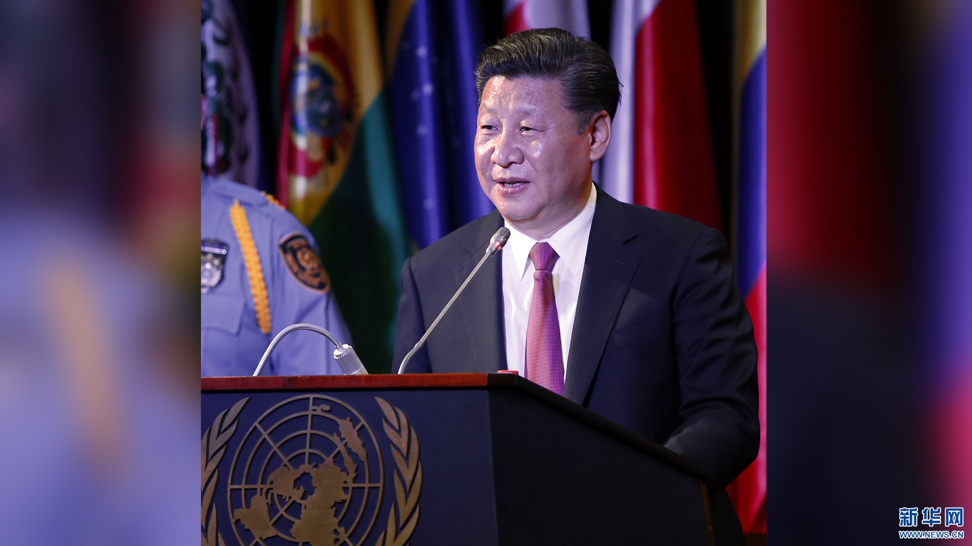 当地时间11月17日,国家主席习近平乘专机抵达基多,开始对厄瓜多尔共和国进行国事访问。厄瓜多尔总统科雷亚在机场为习近平举行隆重欢迎仪式。这是习近平在欢迎仪式上致辞。新华社记者 马占成 摄2016-11-18