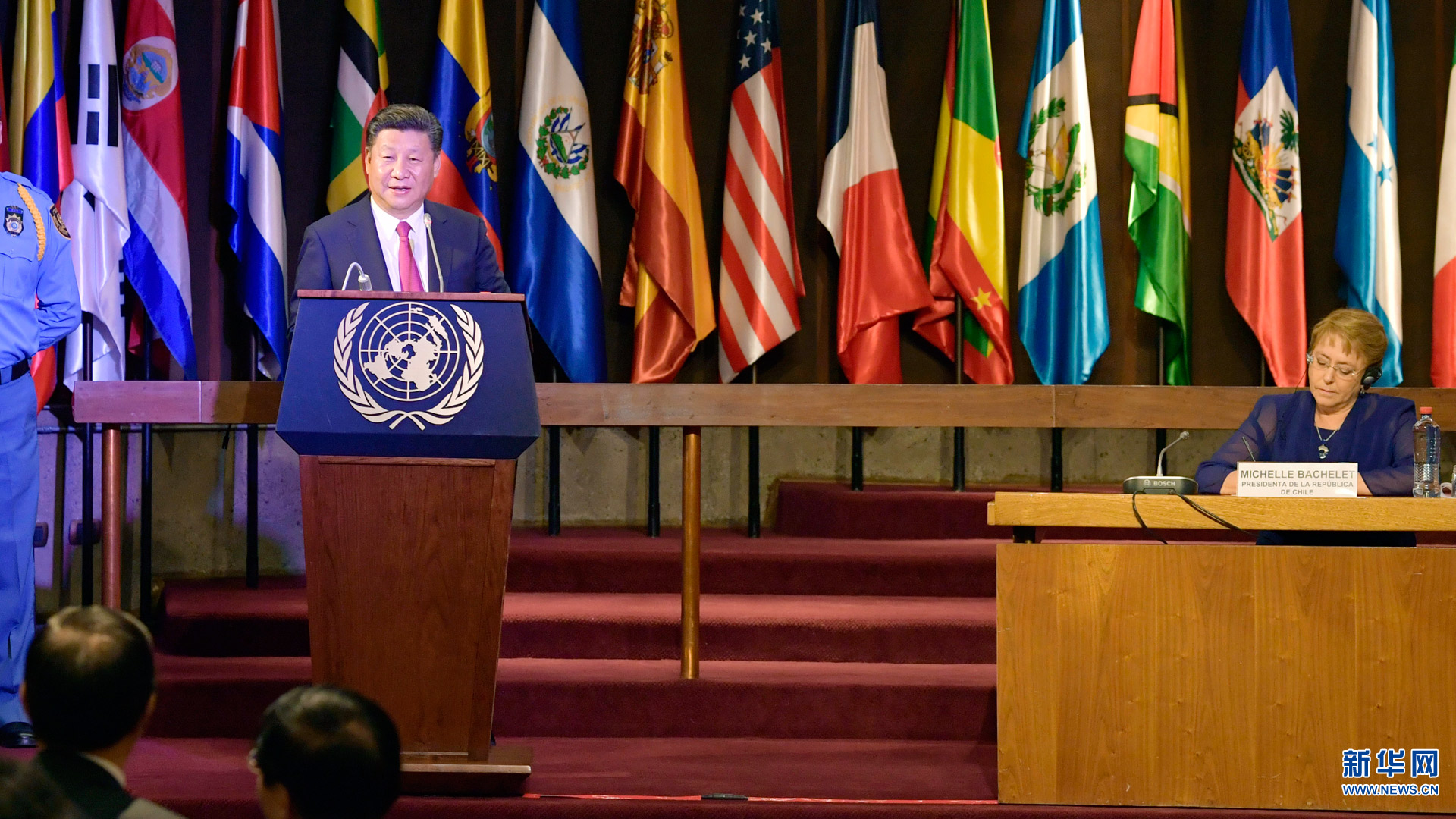 11月22日,国家主席习近平在圣地亚哥联合国拉丁美洲和加勒比经济委员会总部出席中拉媒体领袖峰会开幕式。智利总统巴切莱特陪同出席。在热烈的掌声中,习近平发表题为《开创中拉媒体合作新局面》的致辞。新华社记者 王晔 摄2016-11-23