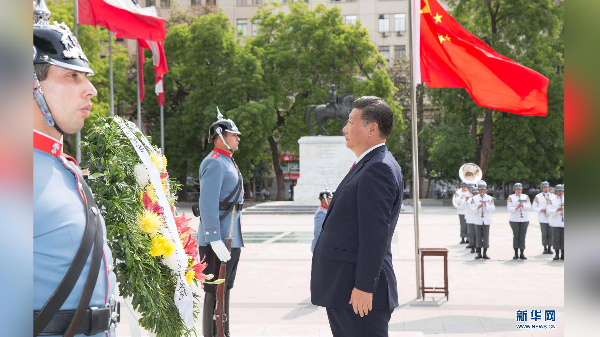 11月22日,国家主席习近平在圣地亚哥向智利解放者奥希金斯纪念碑敬献花圈。 新华社记者 黄敬文 摄2016-11-23
