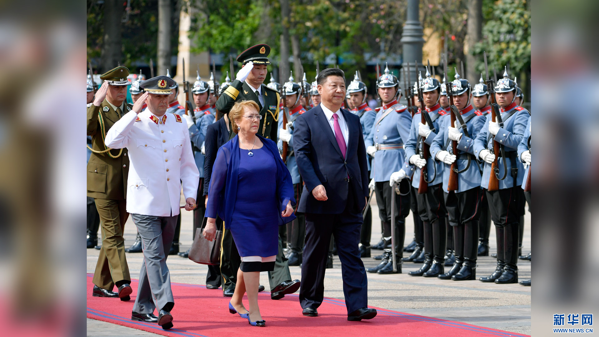 11月22日,国家主席习近平在圣地亚哥同智利总统巴切莱特举行会谈。这是会谈前,习近平出席巴切莱特在宪法广场举行的隆重欢迎仪式。新华社记者 王晔 摄2016-11-23