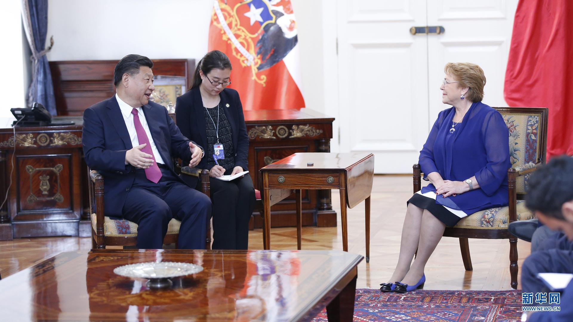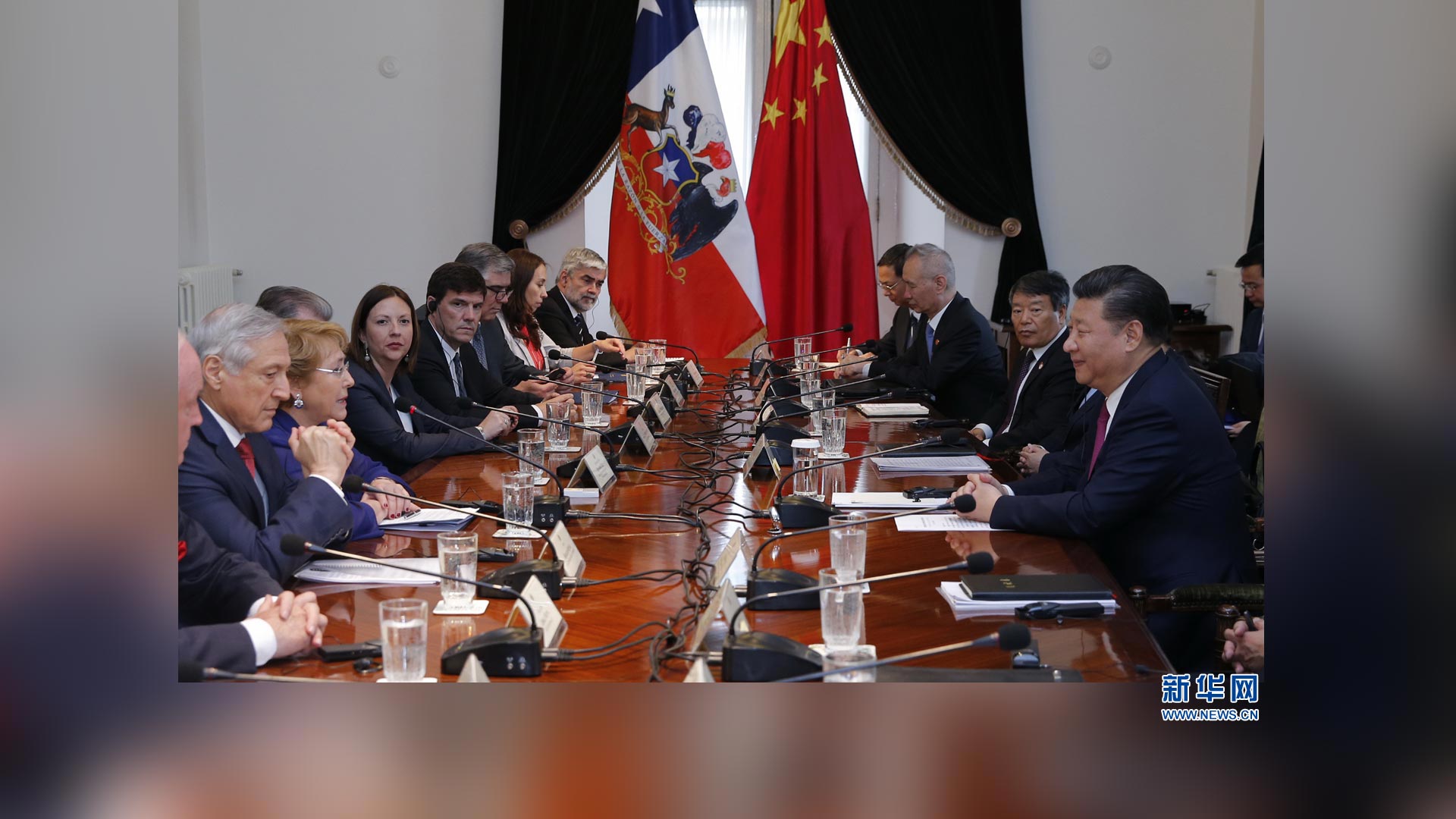 11月22日,国家主席习近平在圣地亚哥同智利总统巴切莱特举行会谈。 新华社记者 鞠鹏 摄2016-11-23