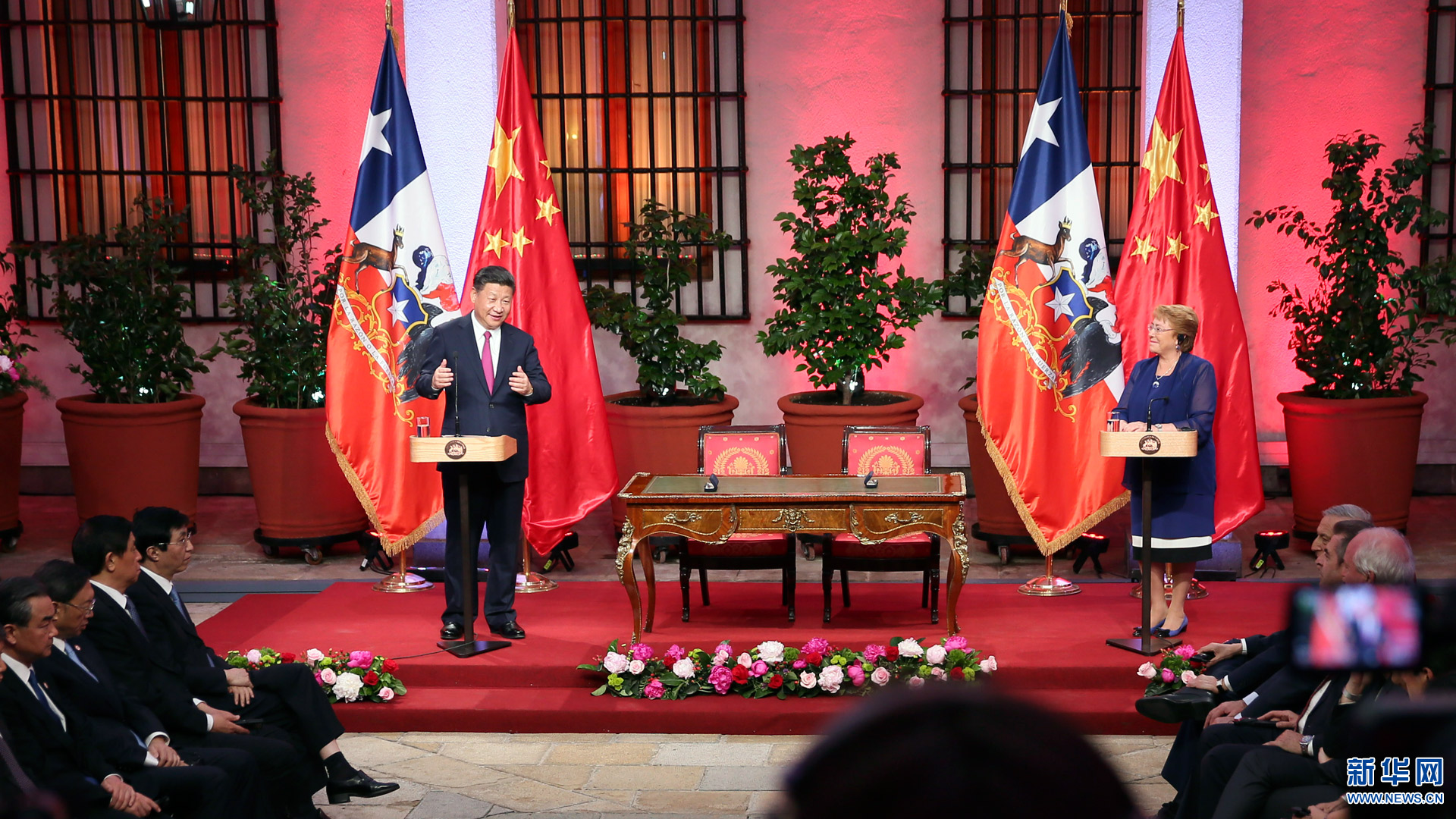 11月22日,国家主席习近平在圣地亚哥同智利总统巴切莱特举行会谈。这是会谈后,两国元首见证经贸、农业、质检、文化、教育、电子商务、信息通信、金融等领域多项双边合作文件的签署。新华社记者 兰红光 摄2016-11-23