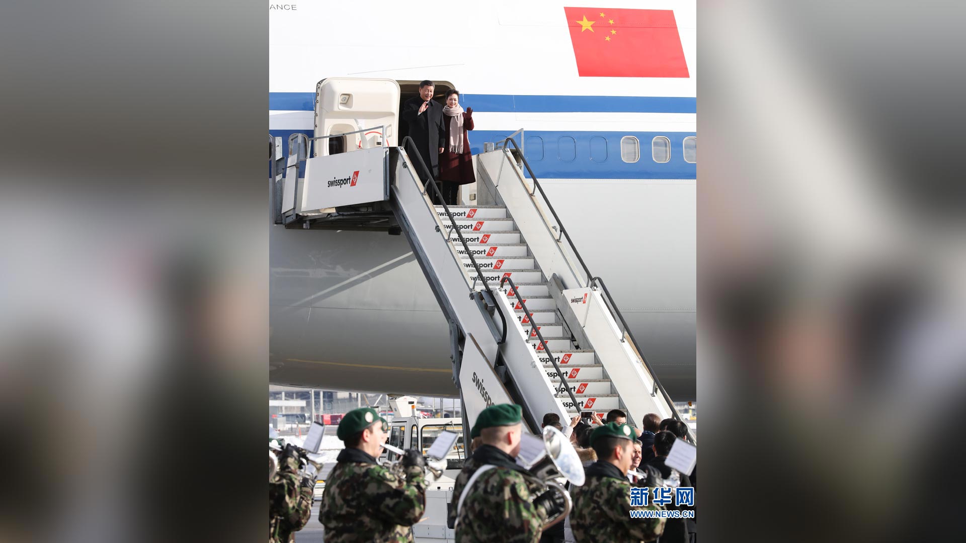 1月15日,国家主席习近平乘专机抵达苏黎世,开始对瑞士联邦进行国事访问。 这是习近平和夫人彭丽媛步出舱门。新华社记者饶爱民摄2017-01-16
