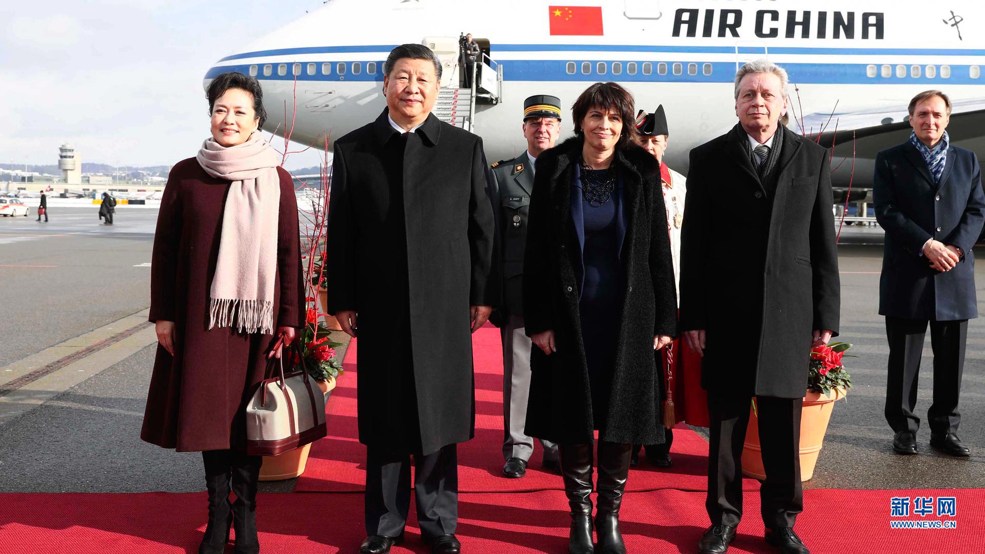 1月15日,国家主席习近平乘专机抵达苏黎世,开始对瑞士联邦进行国事访问。这是瑞士联邦主席洛伊特哈德在机场为习近平和夫人彭丽媛举行隆重欢迎仪式。新华社记者兰红光摄2017-01-16