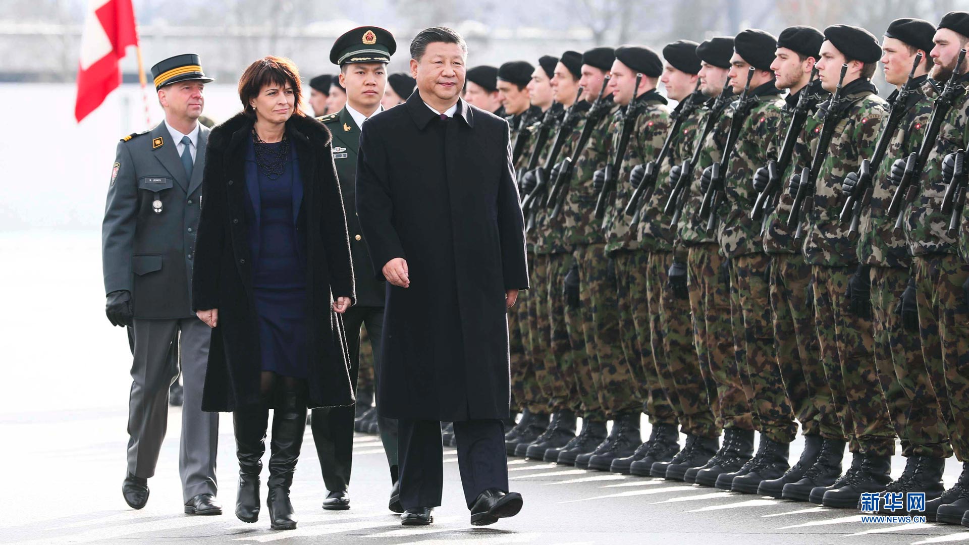 1月15日,国家主席习近平乘专机抵达苏黎世,开始对瑞士联邦进行国事访问。这是习近平在瑞士联邦主席洛伊特哈德陪同下检阅仪仗队。新华社记者兰红光摄2017-01-16