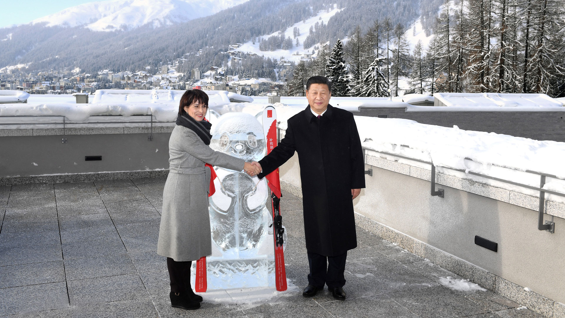 1月17日,国家主席习近平同瑞士联邦主席洛伊特哈德在达沃斯共同启动中瑞旅游年。两国元首在熊猫冰雕像和印有中瑞两国国旗及“中瑞旅游年”字样的滑雪板旁合影留念。新华社记者 丁林 摄2017-01-18
