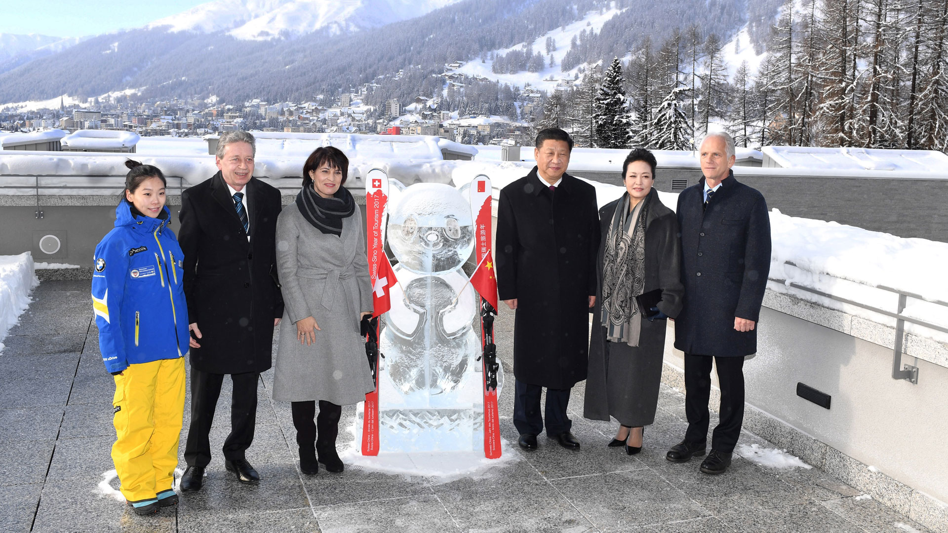 1月17日,国家主席习近平同瑞士联邦主席洛伊特哈德在达沃斯共同启动中瑞旅游年。两国元首夫妇等在熊猫冰雕像和印有中瑞两国国旗及“中瑞旅游年”字样的滑雪板旁合影留念。新华社记者 饶爱民 摄2017-01-18