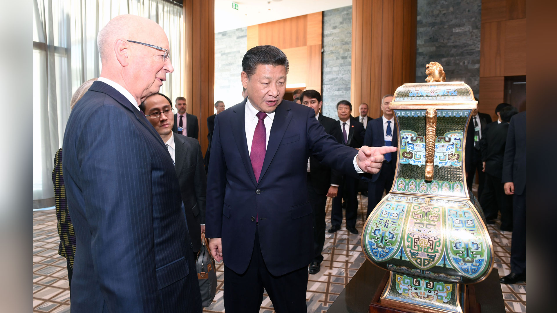 1月17日,国家主席习近平在瑞士达沃斯会见世界经济论坛主席施瓦布。这是习近平向施瓦布介绍中华人民共和国赠送给世界经济论坛的四面方尊。新华社记者 饶爱民 摄2017-01-18
