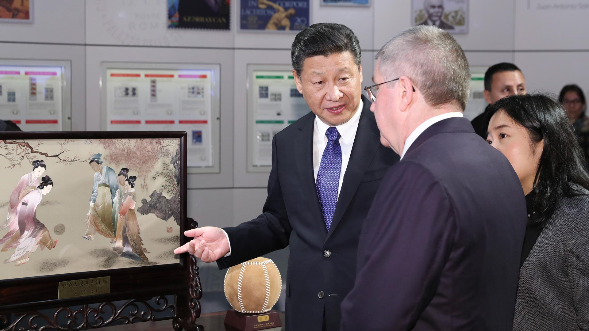 1月18日,国家主席习近平在瑞士洛桑国际奥林匹克博物馆会见国际奥林匹克委员会主席巴赫。这是习近平向巴赫介绍中华人民共和国赠送给国际奥林匹克委员会的苏绣《仕女蹴鞠图》。新华社记者 丁林 摄2017-01-19