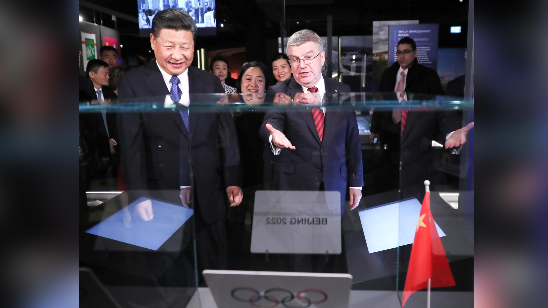 1月18日,国家主席习近平在瑞士洛桑国际奥林匹克博物馆会见国际奥林匹克委员会主席巴赫。这是巴赫向习近平介绍他宣布北京获得2022年冬季奥运会举办权时用的牌子。新华社记者 兰红光 摄2017-01-19
