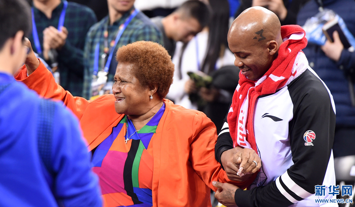 图为2015年12月27日,北京首钢队球员马布里在CBA常规赛战胜吉林九台农商银行队后为母亲(中)庆祝生日。 新华社记者李俊东摄