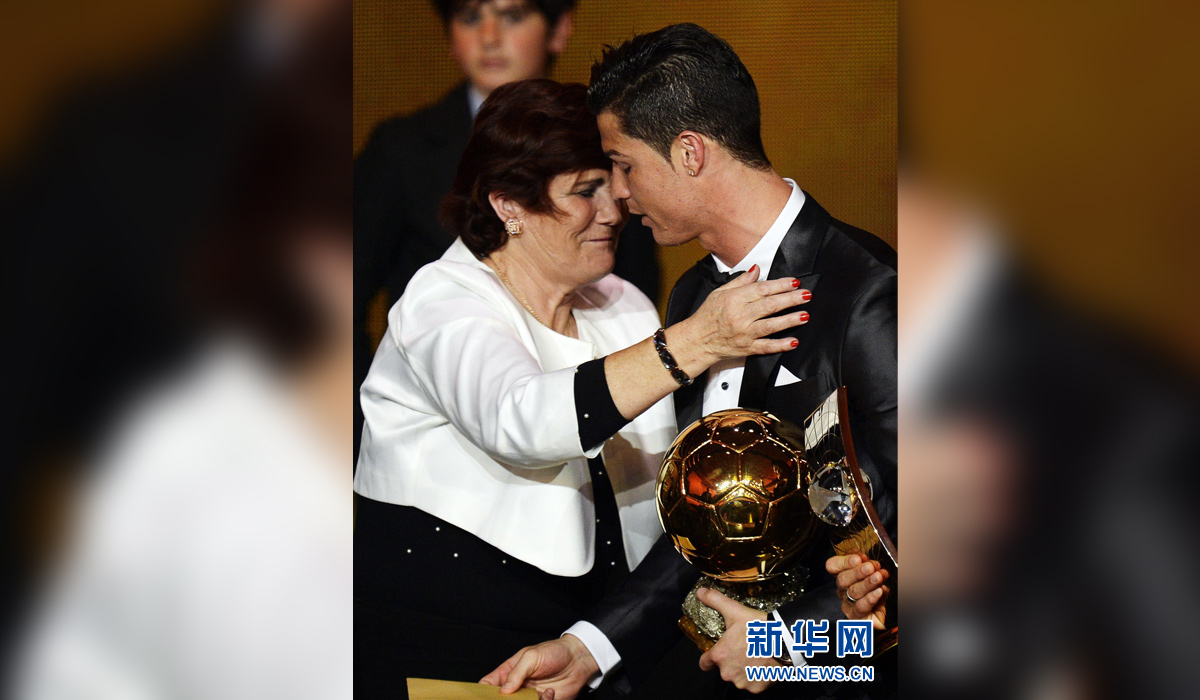 图为2014年1月13日,“金球奖”获得者葡萄牙球星克·罗纳尔多手捧奖杯与母亲分享喜悦。 新华社发