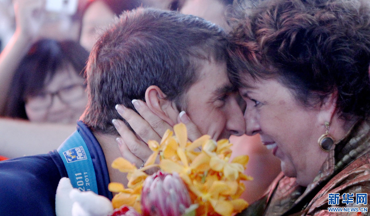 图为2011年7月31日,美国队选手菲尔普斯(左)在第14届游泳世锦赛夺冠后和母亲戴比分享胜利喜悦。 新华社记者费茂华摄