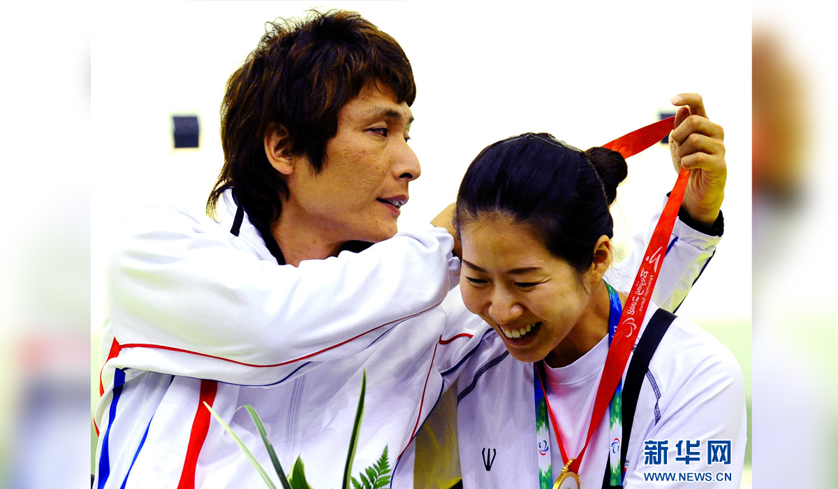 图为2008年9月11日,获得北京残奥会R4级混合组10米气步枪立射-SH2比赛冠军的韩国选手李知锡(左)将金牌挂在一直陪伴和支持自己的妻子朴金顺脖子上。新华社记者任勇摄
