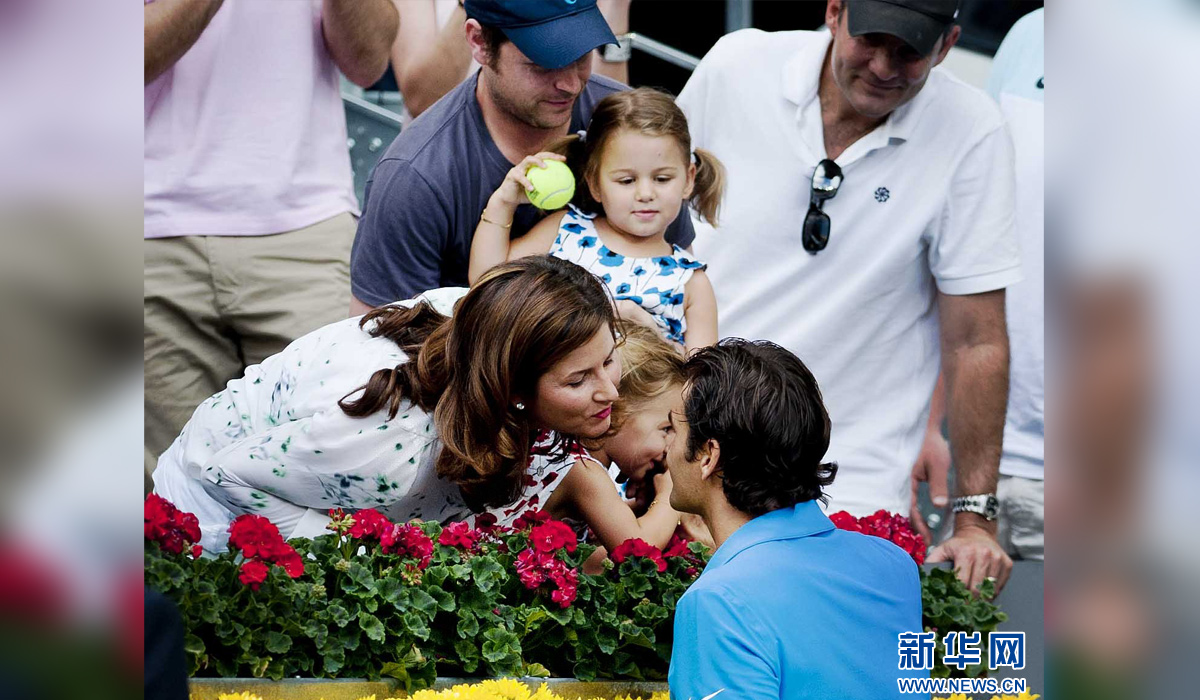 图为2012年5月13日,获得马德里网球公开赛男单冠军的瑞士选手费德勒在比赛后准备亲吻到场观战的妻子。 新华社发(谢海宁摄)