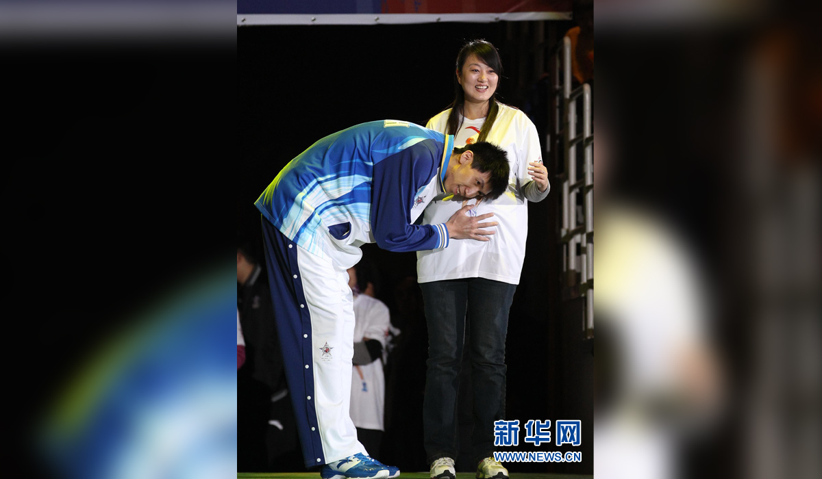 图为2011年3月20日,在中国男子篮球职业联赛(CBA)全明星赛开幕式上,南方队球员张凯(左)和怀孕的妻子一同出场。新华社记者孟永民摄