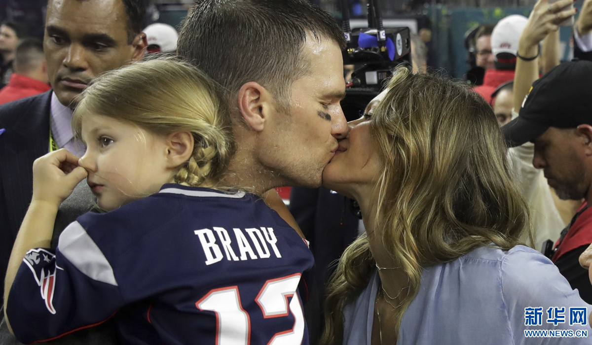 图为2017年2月5日,爱国者队球员布雷迪在球队夺得第51届美国橄榄球大联盟冠军总决赛“超级碗”冠军后与妻子、巴西模特吉赛尔·邦臣亲吻庆祝。新华社发
