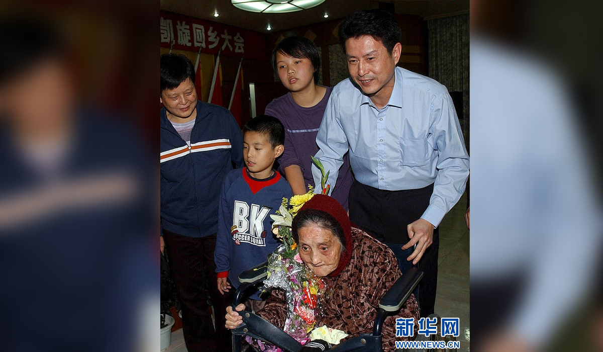 图为2003年11月28日,时任中国女排主教练的陈忠和(右一)推着84岁的母亲和家人团聚。当日,陈忠和在中国女排夺得世界杯冠军后回到家乡福建省龙海市。新华社发