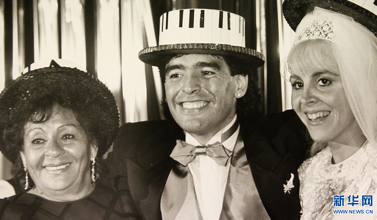 图为1989年11月8日,阿根廷球星马拉多纳(中)在婚礼上与妻子比利亚法内(右)、母亲达尔马合影。 新华社发