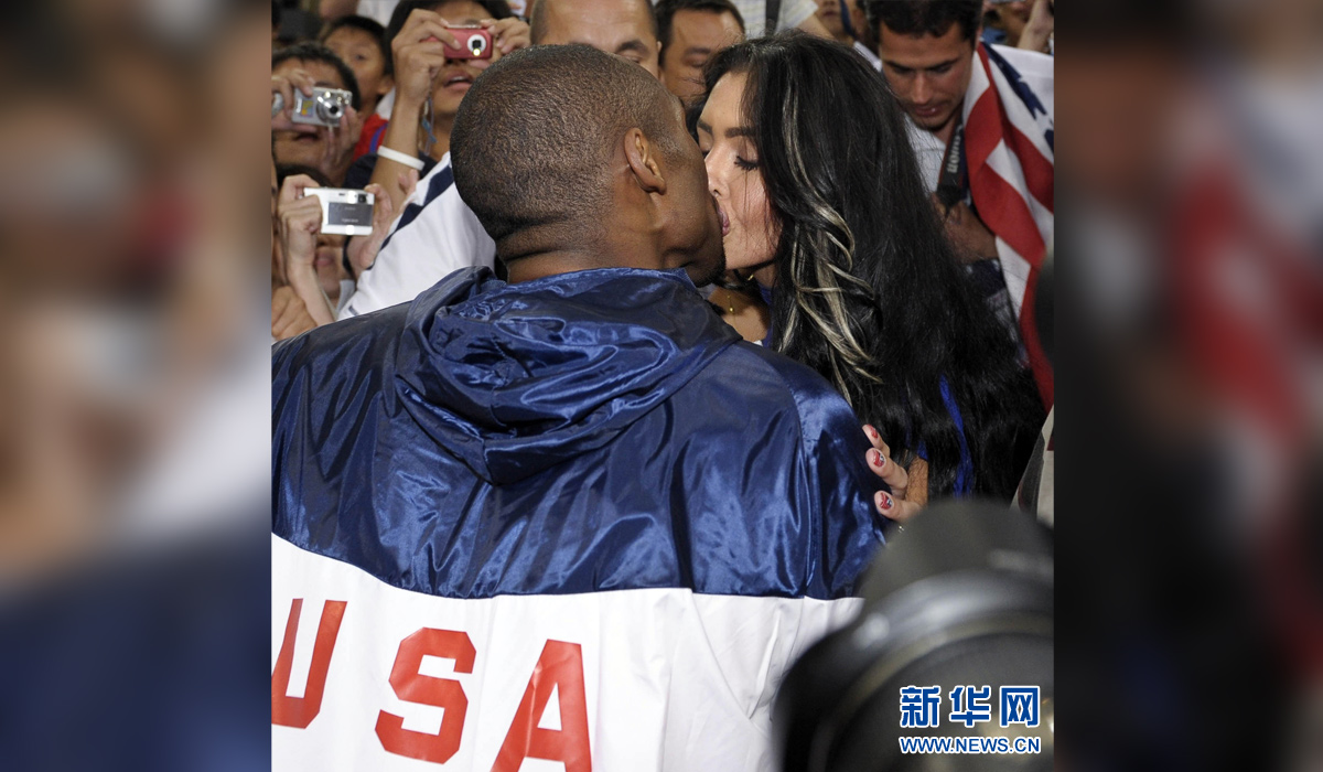 图为2008年8月24日,美国队球员科比(左)在北京奥运会男篮决赛获胜后亲吻妻子。 新华社发(戚恒摄)