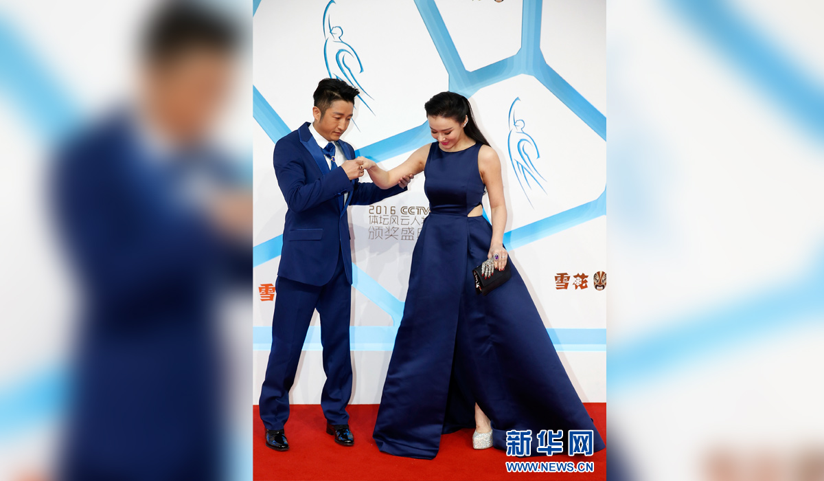 图为2017年1月15日,中国拳击选手邹市明(左)在2016体坛风云人物颁奖盛典红毯上搀扶妻子冉莹颖。 新华社记者王丽莉摄