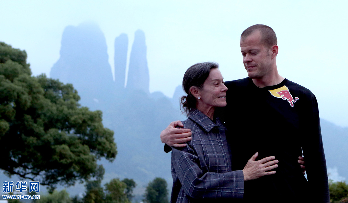 图为2013年9月28日,美国著名翼装飞行大师杰布·克里斯(右)在成功穿越浙江衢州江郎山一线天后与母亲拥抱庆祝。 新华社记者孟永民摄