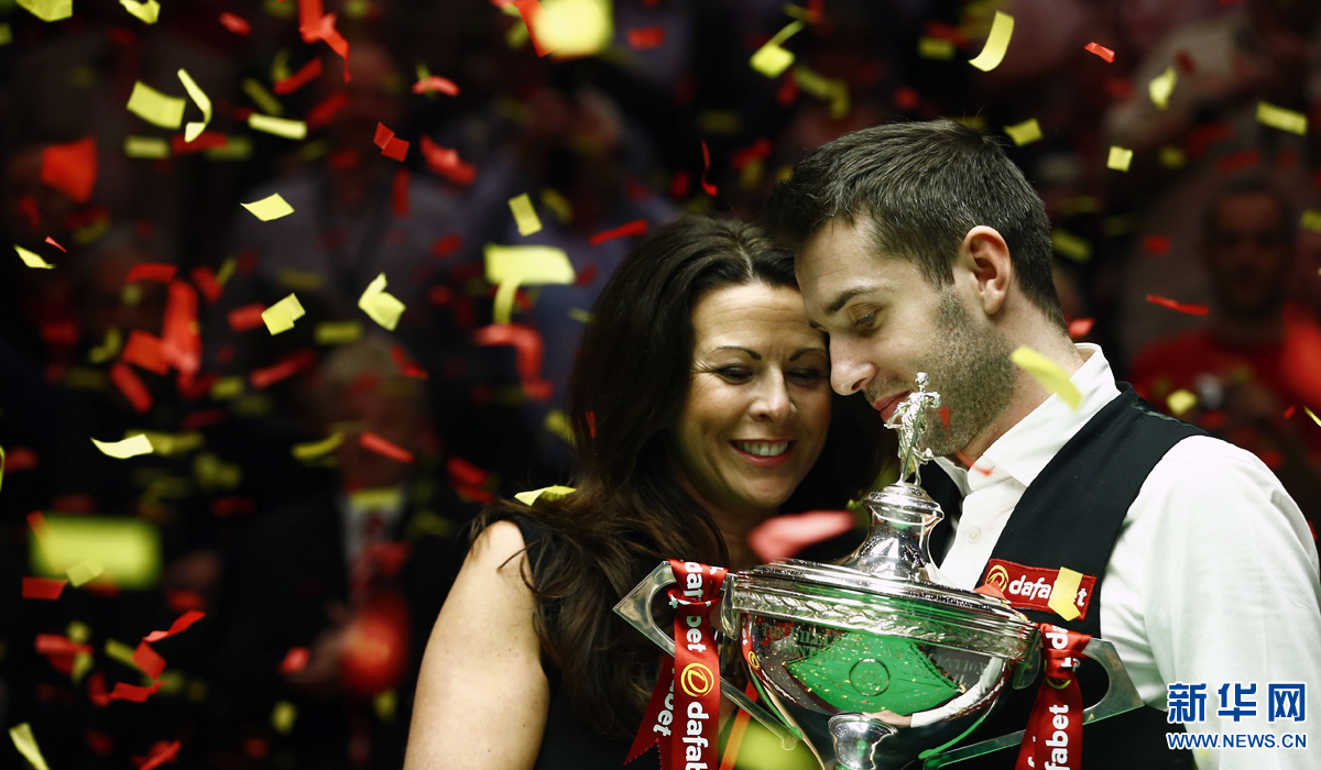 图为2014年5月5日,获得斯诺克世锦赛冠军的英格兰选手塞尔比(右)与妻子维基在颁奖仪式上分享喜悦。 新华社记者殷刚摄