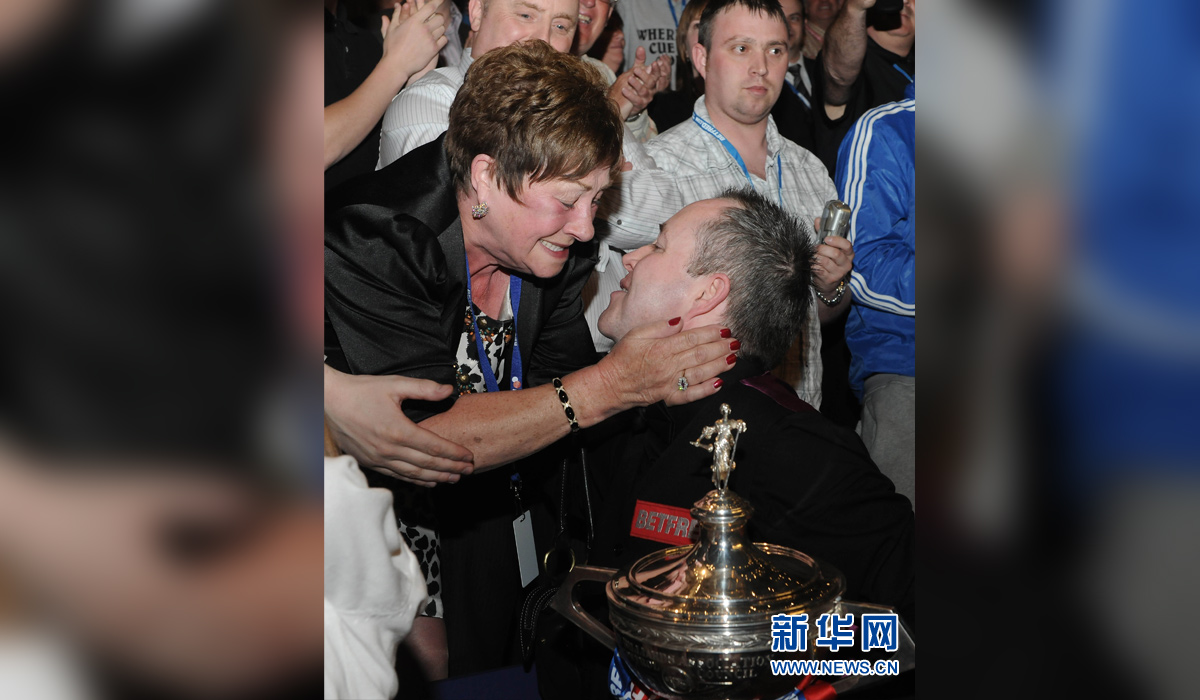 图为2011年5月2日,苏格兰选手希金斯在第四次夺得斯诺克世锦赛冠军后接受母亲的祝贺。 新华社发(曾毅摄)