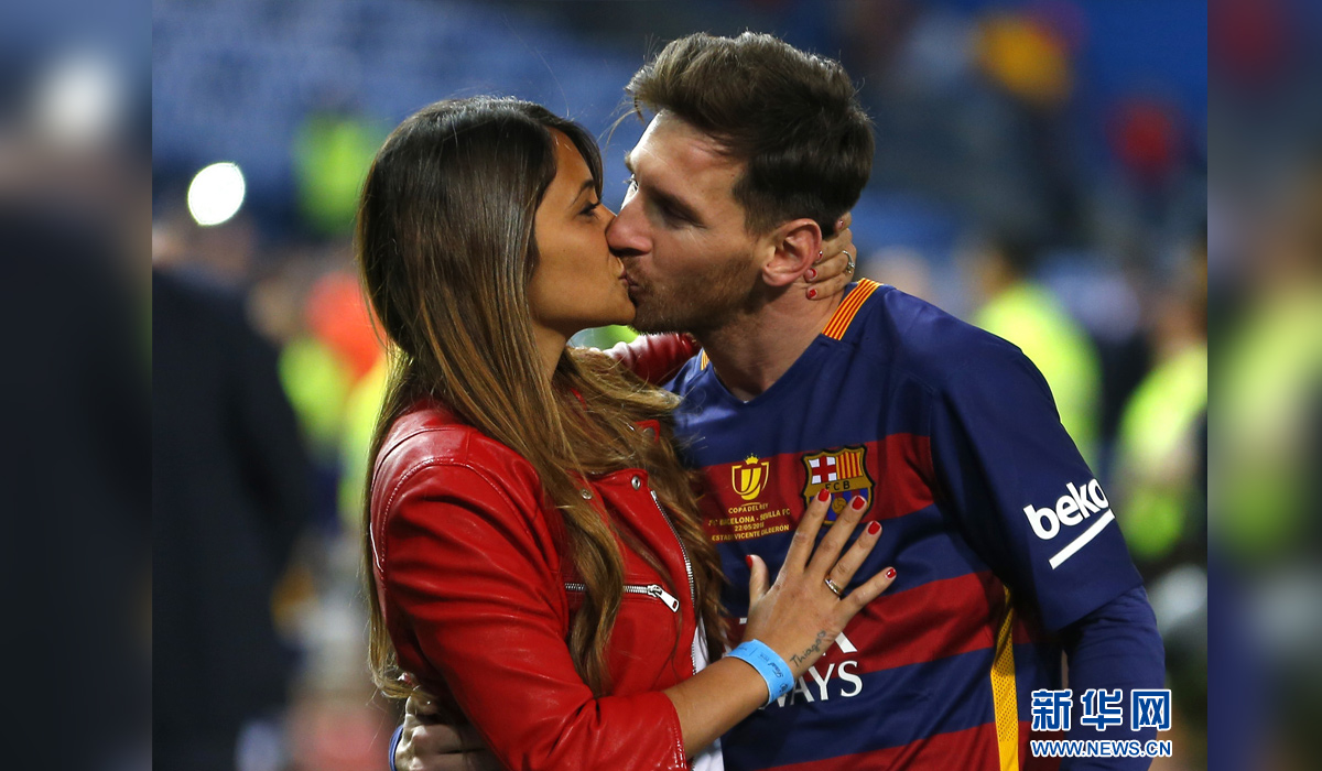 图为2016年5月22日,巴塞罗那队球员梅西(右)在球队夺得西班牙国王杯冠军后与妻子亲吻庆祝。 新华社发