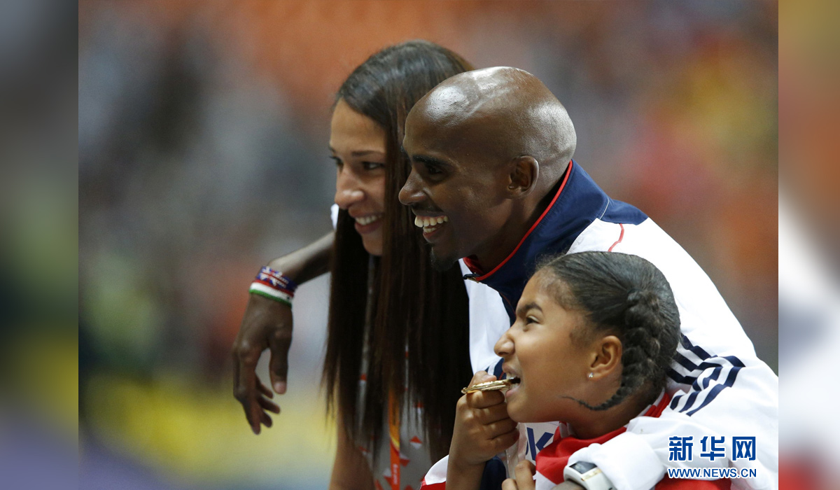 图为2013年8月16日,英国名将法拉赫(中)在获得国际田联世界田径锦标赛男子5000米冠军后与妻子塔妮娅(左)和女儿蕾哈娜一起庆祝。新华社发