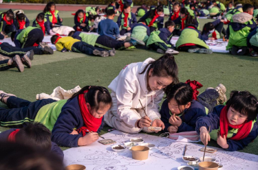 1月14日,四川省自贡市荣县树人小学校操场上,千余名师生共同在巨型“马”字轮廓的画布上创作,以纸绘、陶板绘等形式画出各式生肖马。