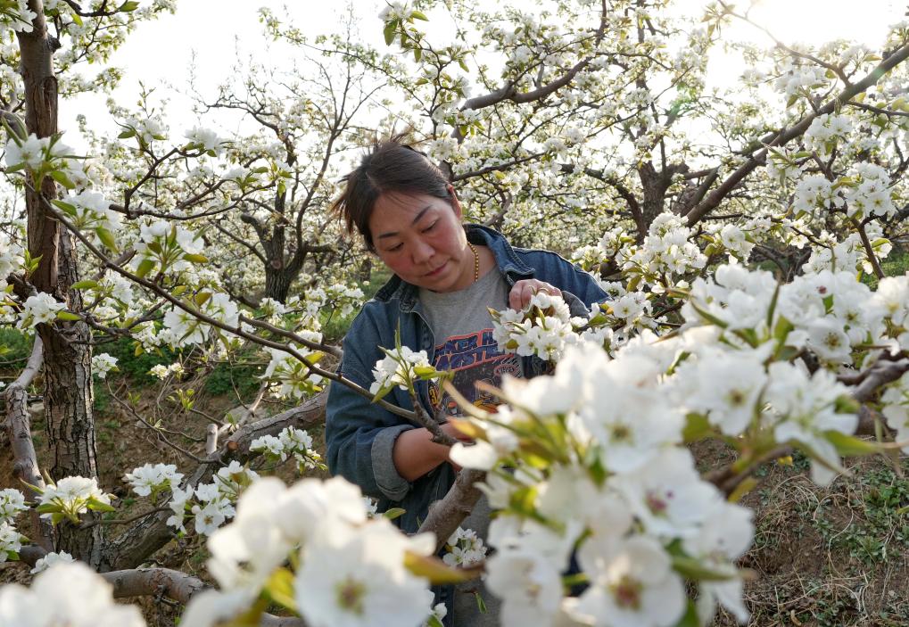 近日,河北省迁安市的梨树陆续开花,果农抢抓农时进行疏花授粉,构成一幅美丽的乡村画卷。